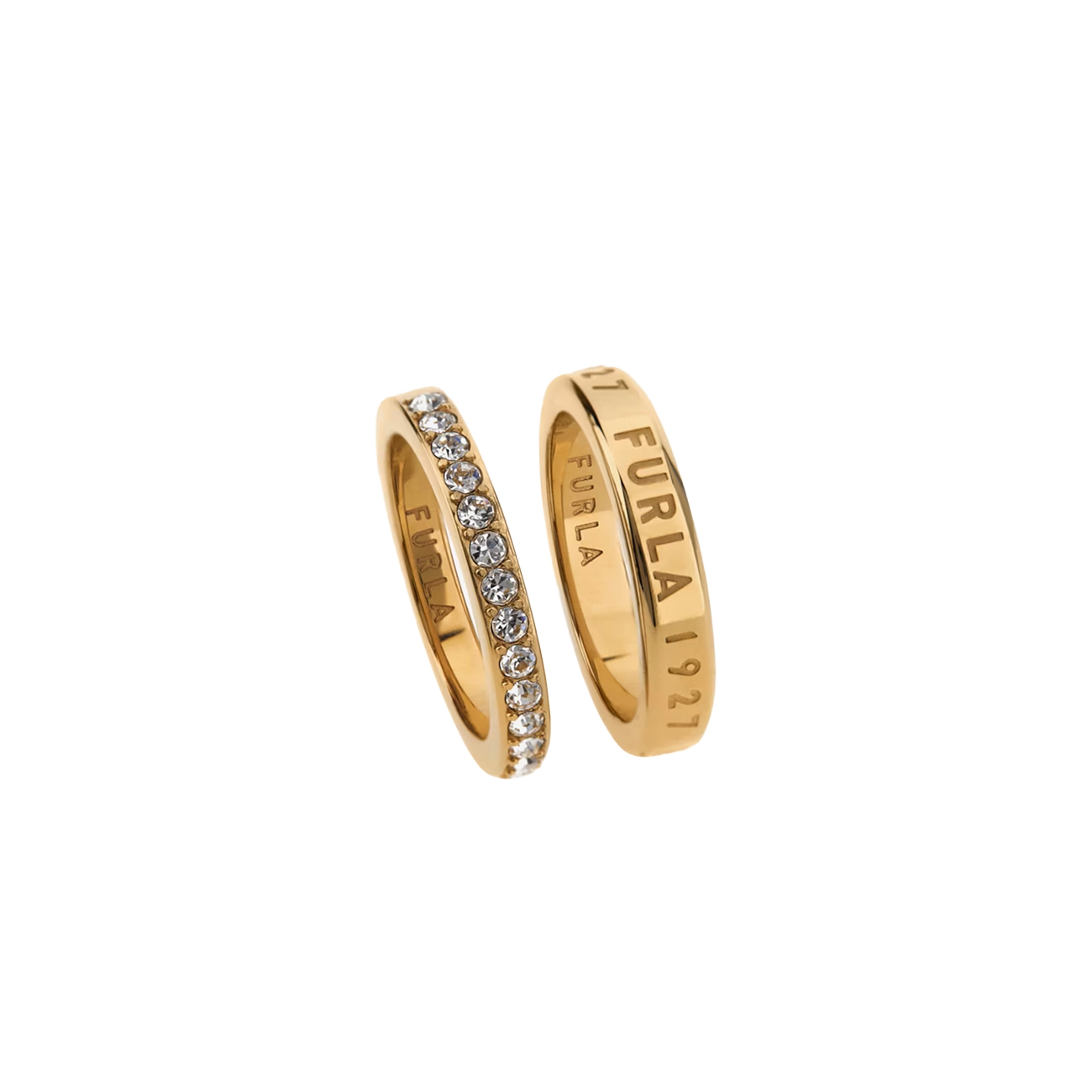 Furla spune povestea unui vis. Încă din 1927 Furla creează genți, portofele, pantofi și mici accesorii din piele atât pentru femei, cât și pentru bărbați. Stilul italian este întipărit în ADN-ul companiei și se regăsește în fiecare detaliu de la materiale la culori. Setul Furla 1927 include două inele de grosimi diferite, fiecare cu un design elegant. Cel mai subțire este decorat cu mici cristale strălucitoare, adăugând o notă de rafinament, iar cel mai gros este gravat cu inscripții distinctive, pentru un contrast subtil. Aceste inele pot fi asortate perfect cu alte bijuterii din aceeași linie, creând un look sofisticat și armonios.