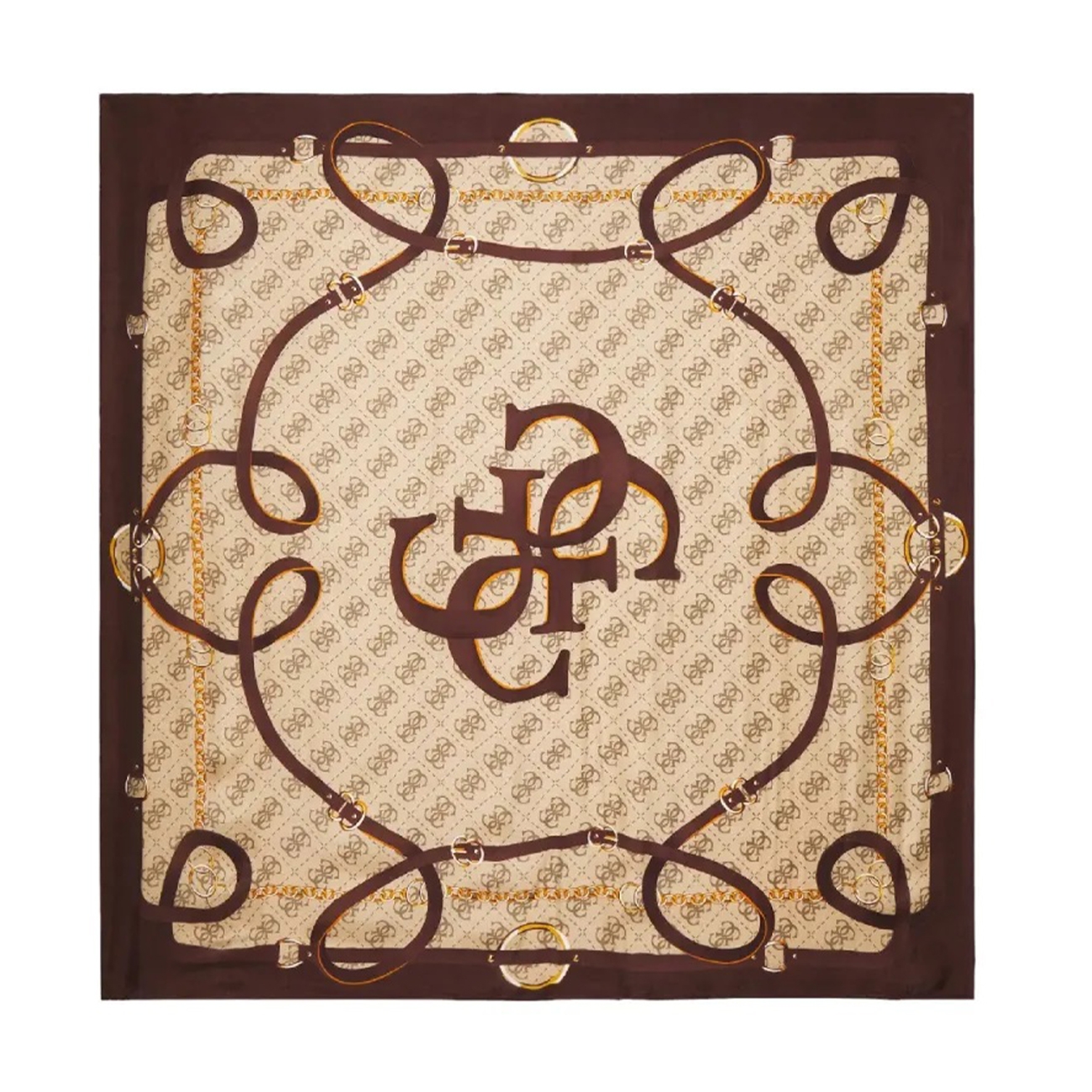 Această eșarfă pătrată Guess, în tonuri calde de maro și bej, cu accente elegante inspirate de detalii metalice aurii, este ideală pentru a completa ținutele de toamnă și iarnă. Designul său este decorat cu monograma Guess centrală și motive decorative tip lanț, conturate de o bordură maro închis, adăugând un aer sofisticat și rafinat.