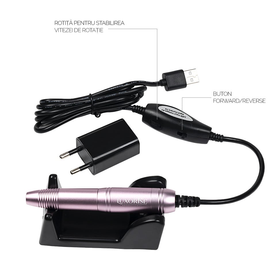 Aspirator praf unghii cu Freza Electrica Tornado Supreme 40W Rose Pink- LUXORISE , alb ofera simultan avantajele unui aspirator pentru praful de unghii si al unei freze profesionale. Mandrina inclusa in pachet se ataseaza la aspirator cu ajutorul unui cablu USB. Dispozitivul are un comutator L/R care permite alegerea sensului de rotatie al bit-ului utilizat si o rotita care regleaza viteza de rotatie a acestuia. Totodata, aspiratorul atrage printr-un design compact si performanta premium . Este dotat cu un motor puternic, care functioneaza cu un nivel redus de zgomot. Specificatii tehnice: Tensiune: 220 - 240V 50 Hz Putere: 40W Freza metalica 20000 rpm inclusa Comutator aspirator ON/OFF Comutator mandrina L/R Culoare: Alb Model: LUX- 980 Pachetul contine: - Aspirator praf unghii - Mandrina - 3 saci de colectare lavabili - Manual de utilizare Se beneficiaza de garantia legala de conformitate asa cum aceasta este reglementata de dispozitiile Legii nr. 296/2004 privind Codul Consumului, cu modificarile si completarile ulterioare coroborate cu dispozitiile OUG nr. 140/2021 privind vanzarea produselor si garantiile asociate acestora, cu modificarile si completarile ulterioare.
