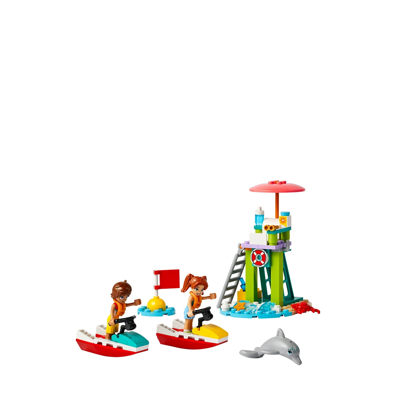 Distracția la malul mării prinde viață cu două scutere acvatice colorate, un turn de salvamar și un delfin prietenos. Setul oferă o scenă ideală pentru povești de vacanță pline de aventură și imaginație.