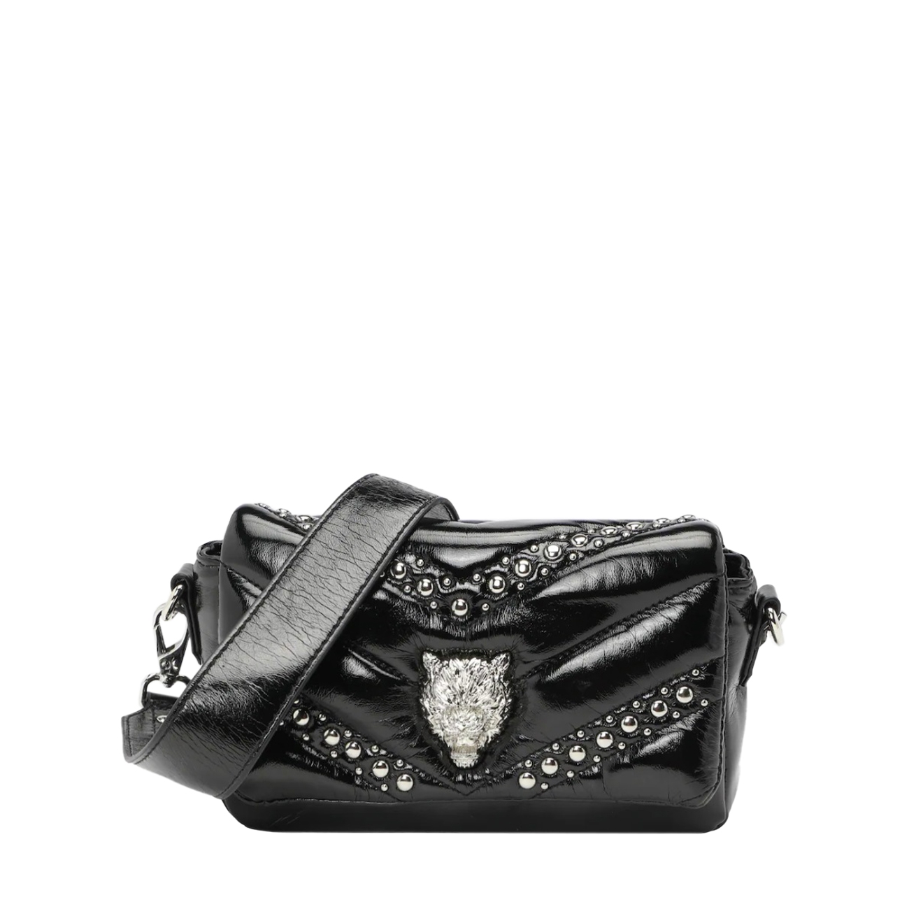 Geanta Plein Sport Small Flap Cady Black este un accesoriu statement cu un look îndrăzneț și modern. Fabricată din material lucios negru, cu decoruri metalice și aplicații tip ținte, aceasta este pusă în valoare de emblematicul cap de lup argintiu din față.