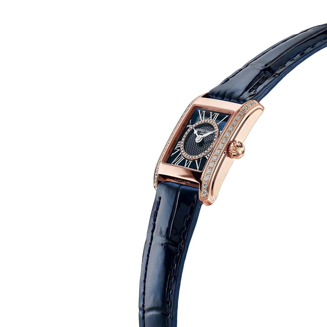 Înființat de Alleta și Peter Stas, Frederique Constant este un brand elvețian a cărui misiune este să ofere ceasuri de lux la prețuri accesibile, pentru a permite tuturor să își trăiască pasiunea. Ceasurile Frederique Constant reprezintă eleganța adusă la superlativ și atrag rapid atenția oricărui cunoscător și iubitor de ceasuri. Carree Ladies este o piesă de lux cu un design rafinat și detalii sofisticate care reflectă tradiția fineței în ceasornicărie. Având o carcasă elegantă și linii clare, acest ceas emană o frumusețe atemporală, ideală pentru doamnele care apreciază un stil sofisticat și discret. Cadranul albastru, decorat cu un motif guilloché Clous de Paris, adaugă o dimensiune aparte și un contrast subtil cu marcajele tradiționale ale orei și numerele romane. Aceste detalii sunt completate perfect de bezelul încrustat cu pietre prețioase, care conferă ceasului un plus de strălucire și lux.