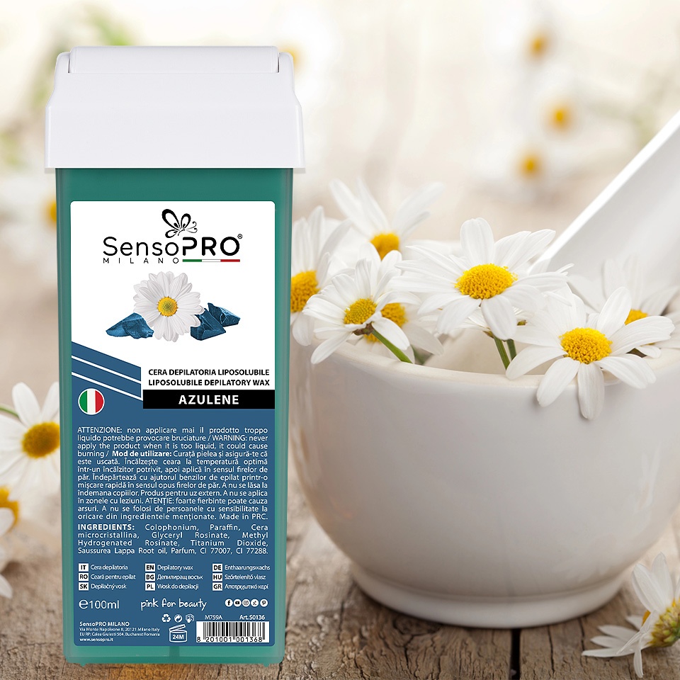 Ceara Epilat Unica Folosinta SensoPRO Milano, Rezerva Azulene 100 ml asigura o epilare eficienta, sigura si fara a crea senzatia de disconfort! Ceara de unica folosinta elimina parul nedorit in mod delicat si este potrivita pentru toate zonele corpului. Ceara pe baza de musetel nu agreseaza pielea, ci are rolul de a hidrata si de calma pielea. Epilarea cu rezerva de ceara ofera o piele catifelata cu un rezultat de pana la 4 saptamani. Datorita ingredientelor, ceara de epilat este potrivita tuturor tipurilor de piele, inclusiv pentru cea sensibila. Forma rezervei asigura o manevrare usoara, astfel poate fi utilizata atat in saloanele profesionale, cat si in intimitatea casei. Mod de utilizare: ✅ 1. Incepeti prin curatarea pielii cu Lotiune inainte de Epilare SensoPRO Milano . Asigurati-va ca pielea este complet uscata inainte de aplicarea cerii. ✅ 2. Introduceti rezerva de ceara intr-un incalzitor potrivit si apoi conectati incalzitorul la priza. ✅ 3. Asteptati 20-30 de minute pentru ca ceara sa fie topita complet (in cazul incalzitoarelor fara suport, este recomandata deconectarea de la priza in momentul aplicarii cerii pe piele). Rezerva de ceara contine un roll-on detasabil. Inainte de aplicare, asigurati-va ca acest roll-on este fixat bine. Distribuiti uniform ceara pe roll-on cu ajutorul unei benzi de epilare, trecand de 3-4 ori cu roll-on-ul peste aceasta pentru a asigura o aplicare uniforma. ✅ 4. Asigurati-va ca temperatura cerii este confortabila pentru piele. Puteti face un test pe o mica portiune a pielii pentru a evita arsurile. ✅ 5. Intindeti ceara pe zona dorita în directia de crestere a firelor de par, aplicand un strat subțire și uniform pentru a asigura o epilare eficientă (in cazul in care ceara a inceput sa se raceasca/intareasca, reconectati incalzitorul la priza pentru cateva minute pana cand ceara ajunge la temperatura dorita). ✅ 6. Aplicati imediat o banda de epilare deasupra cerii (lasand loc de prindere). Presati usor si apoi trageti banda rapid in sens invers cresterii firelor de par. Repetati acest proces pe toate portiunile de piele pe care doriti sa le epilati. ✅ 7. Aplicati Ulei dupa Epilare pentru indepartarea resturilor de ceară și pentru a calma pielea. Evitati expunerea la soare sau la bai fierbinti timp de cateva ore dupa epilare pentru a preveni iritatiile suplimentare. Ceara se foloseste exclusiv pentru uz extern. A nu se aplica pe piele sensibila, afectata de leziuni sau pe zone sensibile. A nu se lasa la indemana copiilor . A se evita supraincalzirea. Se recomanda incalzirea precauta. ATENTIE: foarte fierbinte, poate cauza arsuri! Conditii de pastrare: Nu lasati cartusul de ceara deschis si nefolosit pentru perioade mari de timp. A se pastra in spatii reci, uscate si aerisite, ferite de lumina directa a soarelui, a umezelii , a materialelor cu potential agresiv, eventuale lovituri, zgarieturi sau deformari. Bucura-te de o epilare rapida si de calitate cu Ceara Epilat Unica Folosinta SensoPRO Milano, Rezerva Azulene 100 ml!