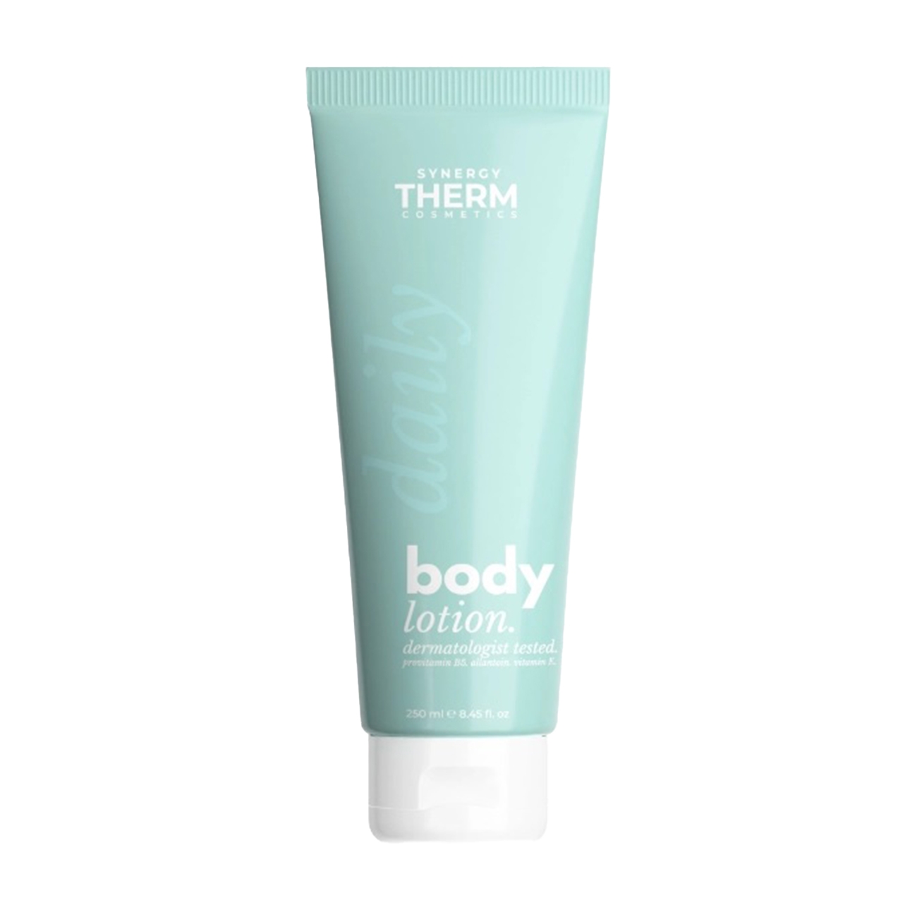 Synergy Therm Cosmetics este o gamă de produse dermato-cosmetice special formulate pentru a oferi îngrijire avansată pielii, având la bază apă termală de calitate superioară. Fiecare produs din această linie este creat cu o combinație unică de ingrediente active, atent selecționate pentru a adresa diverse nevoi ale pielii. Daily Body Lotion este o loțiune hidratantă pentru corp, formulată pentru a oferi o hidratare profundă și de lungă durată, fără a lăsa reziduuri grase. Aceasta este concepută pentru o absorbție rapidă, lăsând pielea catifelată și confortabilă, cu un parfum delicat de flori albe și migdale. Alantoina și panthenolul-ul din compoziția sa, sunt ingrediente care calmează și regenerează pielea, oferind protecție împotriva factorilor de mediu și întărind bariera hidrolipidică.