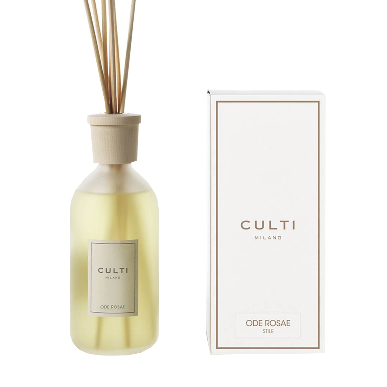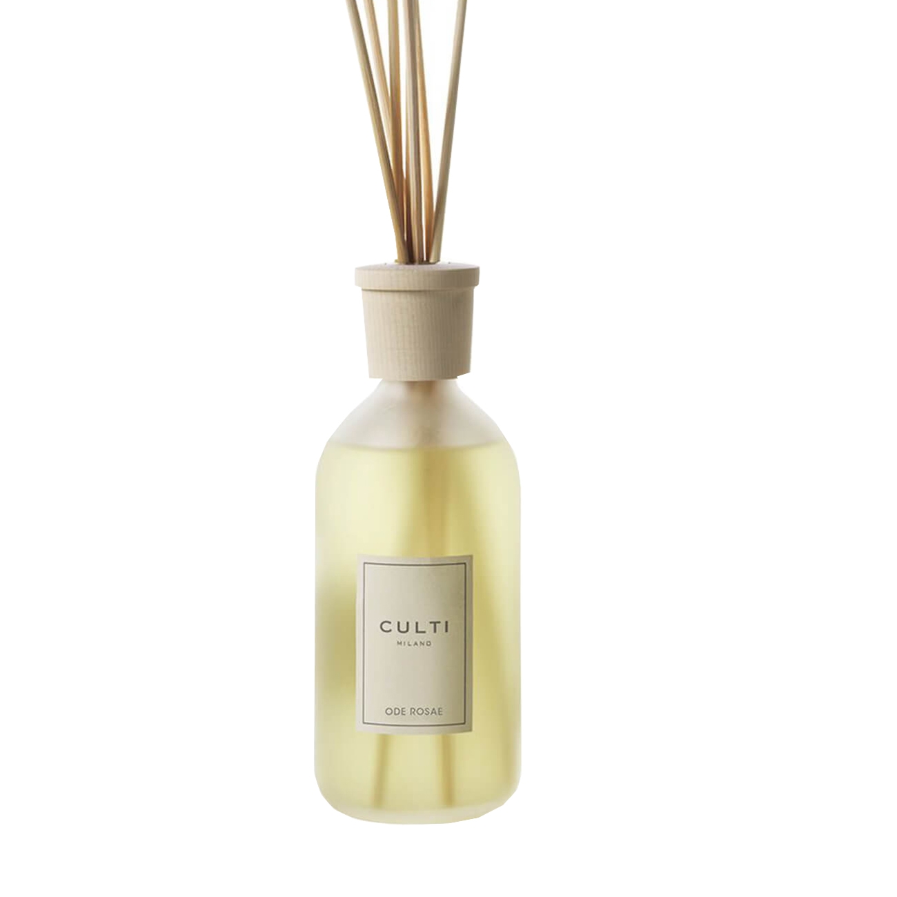 Glass bottles with ivory-coloured labels and cap in natural maple wood. Ode Rosae: Paying homage to the nobility of the rose, the queen of the garden; bowing down to touch the untamed power of her wood, letting her stirring delicacy go to your head. A flower for men.