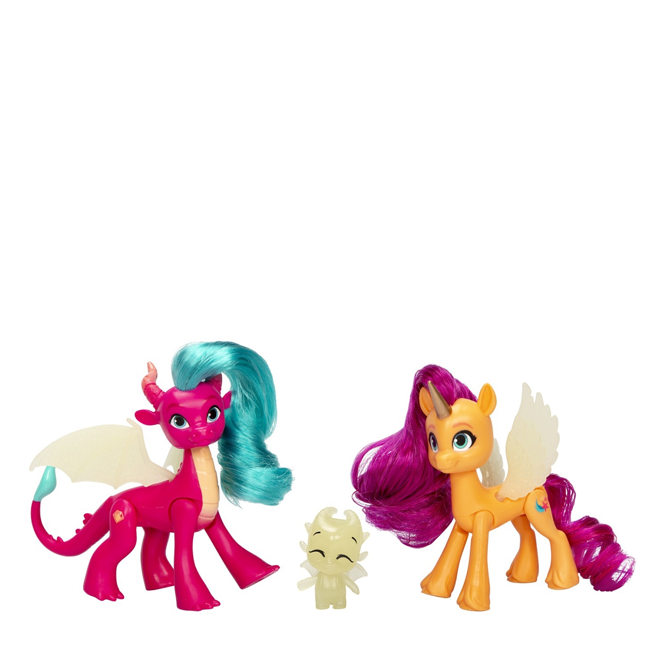 Pregătește-te pentru aventuri magice cu setul „My Little Pony Dragon Light Reveal”! Acest pachet fermecător conține două figurine adorabile: Sunny Starscout, înaripata curajoasă cu coamă mov strălucitoare, și un dragon roșu cu detalii turcoaz, prietenul ei de nădejde.