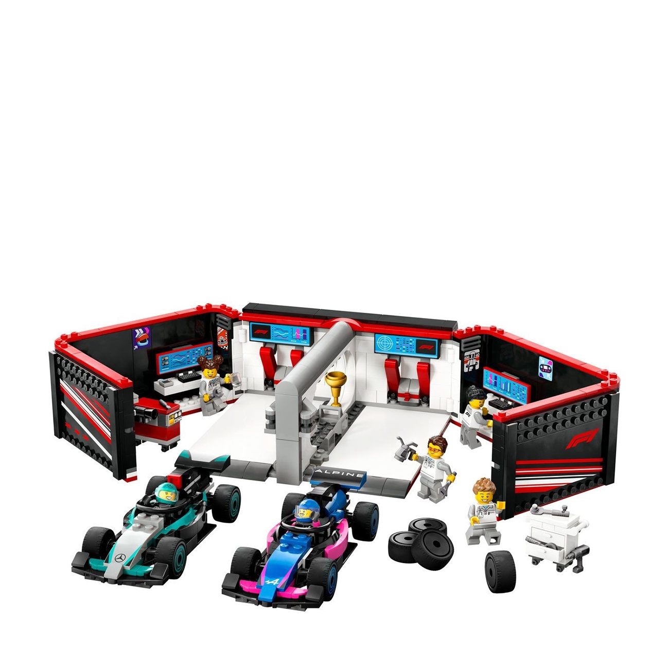 Trăiește adrenalina curselor de Formula 1 cu setul LEGO City F1 Garage & Mercedes-AMG & Alpine Cars! Acest set spectaculos conține două mașini F1 de la Mercedes-AMG și Alpine, o întreagă echipă de pit-stop, trofee, echipamente și un garaj complet echipat. Copiii pot recrea scene autentice din paddock, se pot juca de-a mecanicii sau pot concura pentru victorie cu echipele oficiale din F1!