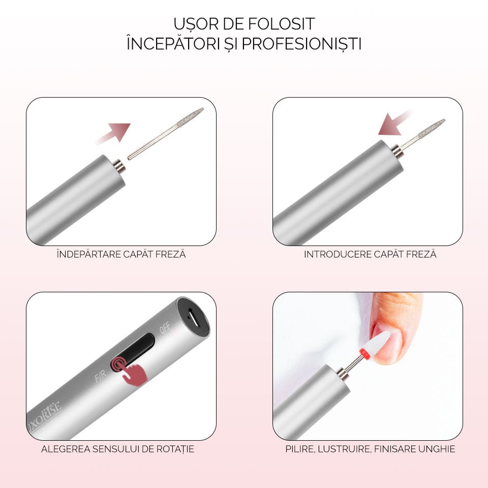 Freza Unghii Portabila TITANIUM PEN PRO - LUXORISE, culoare Silver este cel mai slim, elegant si util device pentru manichiura si pedichiura. Cu un design minimalist si practic, dimensiuni extrem de reduse si utilizare usoara, freza poate fi folosita atat de amatori pentru pilire, ascutire, lustruire, cat si de profesionisti pentru realizarea unor retusuri rapide. Dispozitivul are un comutator L/R ce permite alegerea sensului de rotatie al bit-ului utilizat. Mandrina are 15.000 RPM. Incarcarea cu energie se poate face de la orice dispozitiv cu USB! Mod de utilizare: Inainte de utilizare, incarcati freza minim 60 de minute, cu ajutorul incarcatorului din cutie.Pentru a pornii freza si pentru schimbarea sensului de rotatie apasati scurt butonul F/R. Pentru oprire apasati butonul in partea ON/OFF. Specificatii tehnice: Viteza: 15.000 RPM Lumina LED Tensiune alimentare: 5V Culoare: Silver Material: Metal Dimensiune mandrina: 16 x 1.5 cm Dimensiune cutie: 19 x 7.3 x 4 cm Greutate: 58g Sens rotatie FWD / REV Baterie: Li-Ion Capacitate baterie: 320 mAh Model: LUX-1500PND Putere 8W Pachetul contine: - 1 buc x Mandrina - 1 buc X Capat Ceramica - 11 buc x Capete Freza - 6 buc x Capete de Slefuit - 1 buc x Cablu incarcare USB - 1 buc x Manual de utilizare Avantaje: - Design minimalist - Usor de folosit - Compacta - Silentioasa - Potrivita lustruire, pilire, ascutire, retusuri - Incarcare prin USB - Portabila - Autonomie baterie pana la 5h Se beneficiaza de garantia legala de conformitate asa cum aceasta este reglementata de dispozitiile Legii nr. 296/2004 privind Codul Consumului, cu modificarile si completarile ulterioare coroborate cu dispozitiile OUG nr. 140/2021 privind vanzarea produselor si garantiile asociate acestora, cu modificarile si completarile ulterioare.
