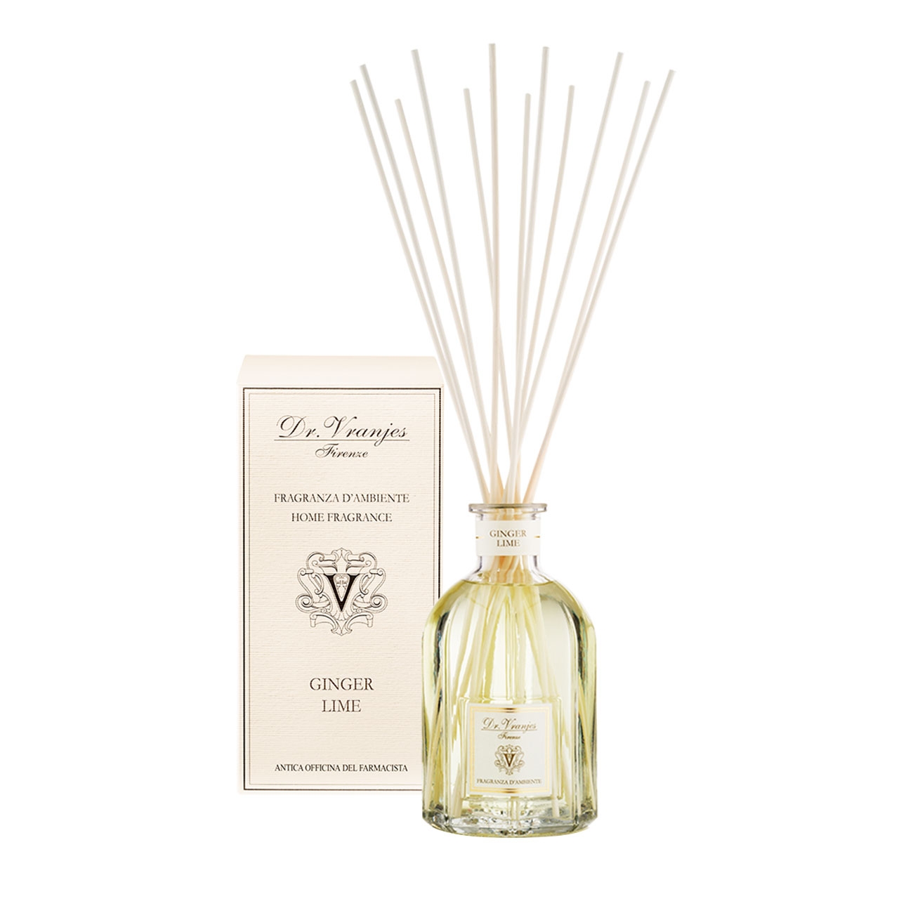 De-a lungul a peste 40 de ani, Dr. Vranjes Firenze a reușit să captureze eleganța Florenței, tradiția meșteșugurilor și arta parfumeriei într-o sticlă, oferind astfel o experiență multisenzorială prin arome pentru casă și produse de înfrumusețare personală. Ginger Lime Glass Bottle este o esență ambientală inspirată din amintirile olfactive ale Maestro Paolo Vranjes, evocând momentele petrecute în atelierul bunicului său, un colecționar pasionat de parfumuri și misterele lor. Mirosul vibrant și revigorant de ghimbir proaspăt și lime se îmbină armonios, reconstituind atmosfera unică a atelierului, unde mirosurile necunoscute erau descoperite și explorate. Această esență aduce o notă de energie proaspătă și vitalitate, perfectă pentru a transforma orice încăpere într-un spațiu luminos, plin de curiozitate și inspirație.