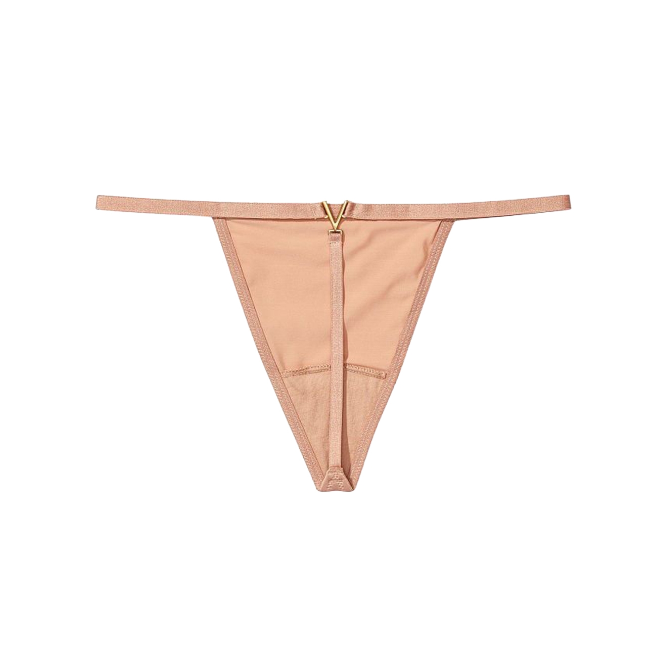 Victoria’s Secret este cel mai mare retailer specializat de lenjerie pentru femei, parfumuri, îngrijire corporală, accesorii și îmbrăcăminte, cu peste 1.350 de magazine în întreaga lume. V-Hardware Adjustable V-String Panty - Acești chiloți din microfibră mătăsoasă sunt eleganți și confortabili, fiind decorați cu un V luxos, de un ton auriu, pe spate. Au o talie joasă cu șnur ajustabil, oferind un confort personalizat, și nu au acoperire pe spate pentru un efect seducător.