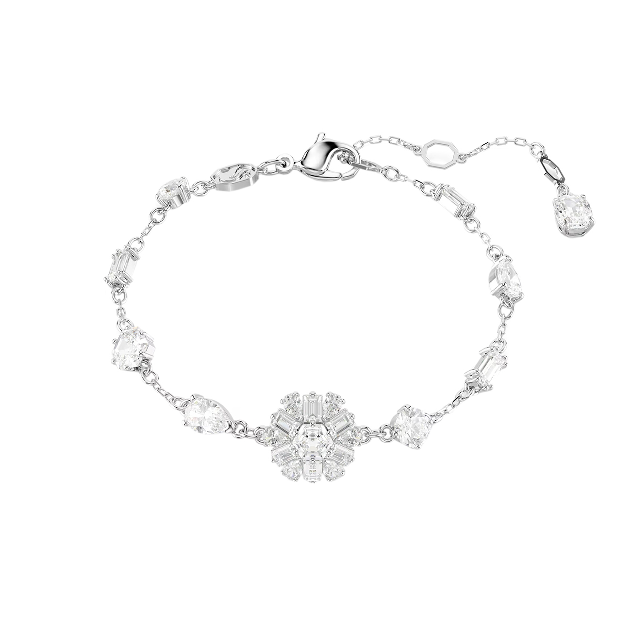 Brățară pentru femei Swarovski Idyllia, finisată în ton argintiu, cu un design delicat și detalii florale din cristale tăiate cu precizie. Piesa centrală tip floare este înconjurată de cristale de diferite forme, oferind un efect strălucitor și rafinat, ideal pentru ocazii speciale sau ținute elegante.
