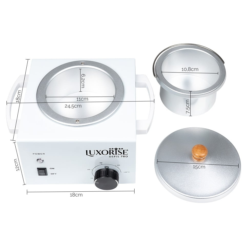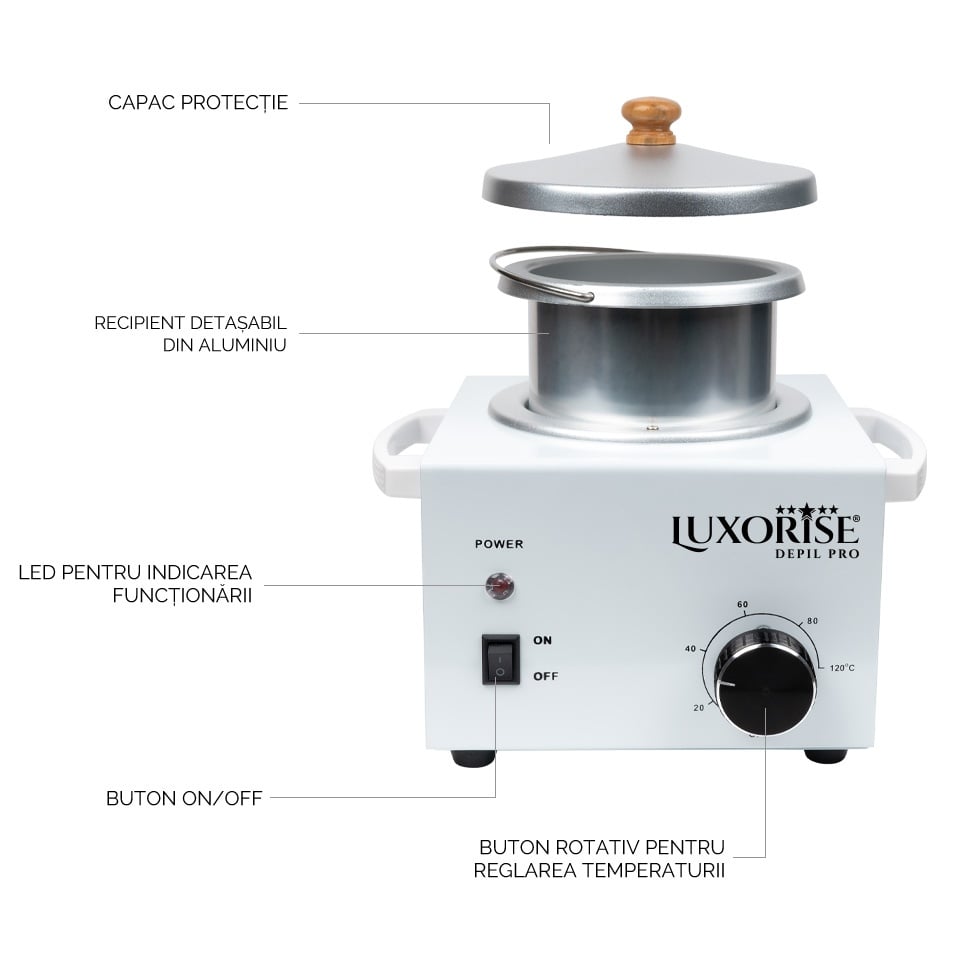 Incalzitorul de ceară LUXORISE este dotat cu caracteristici tehnice care îl fac ideal pentru utilizare profesională: