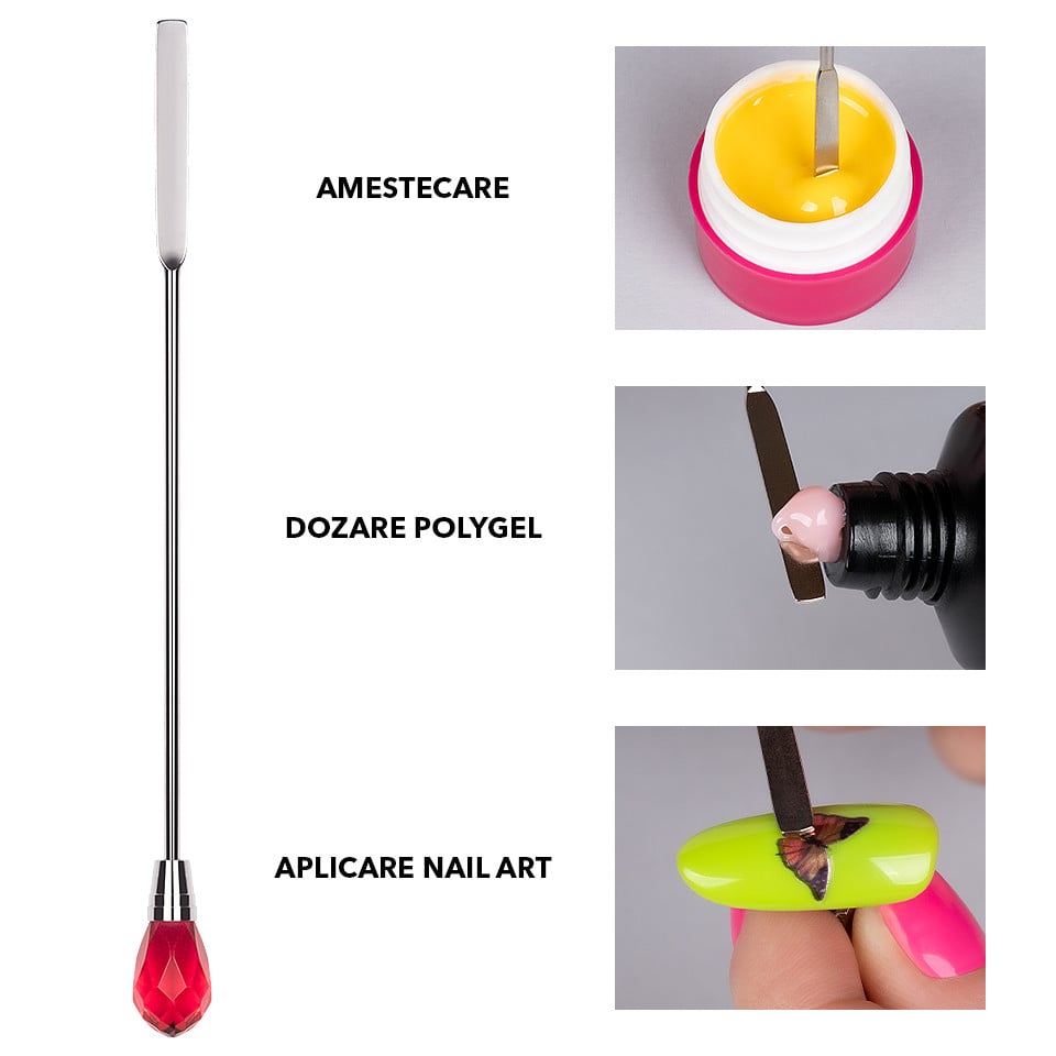 Instrument Manichiura Mixare & Decorare SensoPRO Milano, Crystal Pink - Spatula din otel inoxidabil este special pentru amestecarea gelului, nail art dar si pentru stilizare si indepartarea diverselor materiale de pe unghii. Forma speciala de spatula permite amestecarea gelului, pudrei acrylice, glitterului, pigmentilor etc. In acelasi timp, forma este perfecta pentru dozarea precisa a polygelului, stilizare si indepartarea surplusului de gel, oja nepolimerizata. Este un instrument multifunctional, perfect atat pentru amatori cat si pentru profesionisti. - Materiale calitate superioara - Utilizare multipla - Usor de curatat - Confortabil & usor de manipulat - Util pentru fixarea stickerelor, tatuajelor, foliilor de transfer - Util pentru dozare polygel