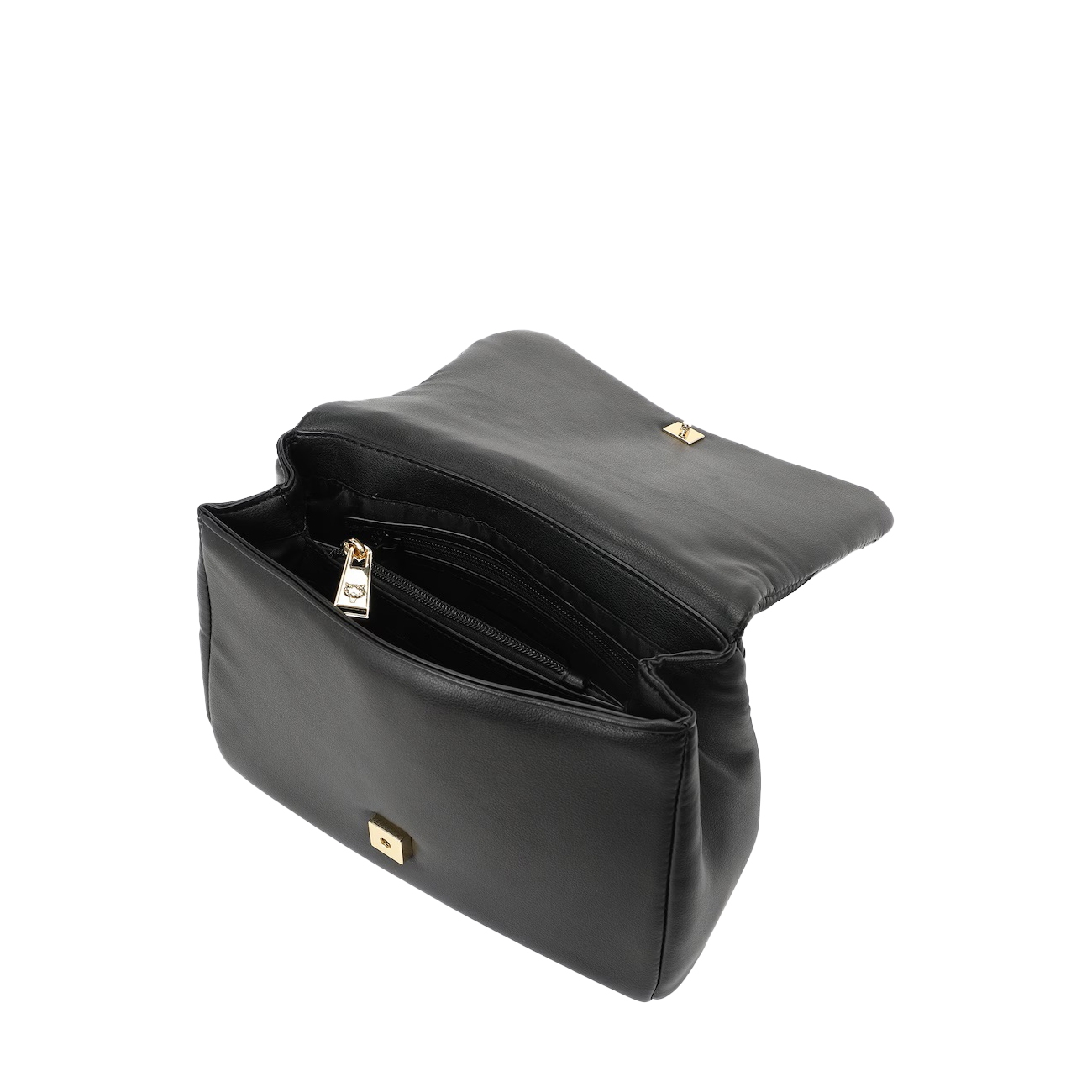 Geantă de mână PLEIN cu design matlasat în relief, confecționată din material sintetic moale, cu logo metalic aplicat frontal și detalii aurii. Mânerul fix și lanțul decorativ adaugă un aer elegant, ideal pentru un look urban sofisticat.