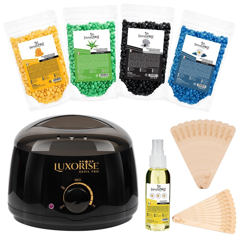 Kit Epilare Ceara Duo Velvet Skin, SensoPRO Milano este kitul perfect pentru o sedinta de epilare rapida si eficienta. Duo Velvet Skin este kitul de epilare potrivit atat pentru femei cat si pentru barbati. Acum, toate produsele de care ai nevoie sunt in acest kit unic: - 1 buc x Incalzitor Ceara Profesional PRO WAX 150 - Luxorise, 500ml - 1 buc x Ceara perle Azulene 100g, SensoPRO Milano - 1 buc x Ceara perle Miere 100g, SensoPRO Milano - 1 buc x Ceara perle Aloe 100g, SensoPRO Milano - 1 buc x Ceara perle Black Pearls 100g, SensoPRO Milano Ceara- nuantele sunt in functie de stocul disponibil! - 1 buc x Ulei dupa epilare Musetel, 100ml, SensoPRO Milano- aroma in functie de stocul disponibil - 10 buc x Spatula mare ceara, SensoPRO Milano - 10 buc x Spatula mica ceara, SensoPRO Milano Respectati intotdeauna modul de utilizare. Mod de utilizare: Epilare cu ceara: 1. Asaza incalzitorul pe o suprafata dreapta si rezistenta la temperatura; 2. Asigura-te ca rotita incalzitorului este pe pozitia OFF, apoi conecteaza incalzitorul la priza; 3. Toarna cantitatea de ceara dorita in recipientul incalzitorului si pune capacul; 4. Seteaza incalzitorul la temperatura maxima cu ajutorul rotitei si încalzeste ceara pana devine complet lichida, apoi pastreaz-o constant la o temperatura medie. Amesteca din cand in cand pentru a verifica soliditatea, ceara este gata de aplicare cand devine cremoasa (supravegheati constant ceara in momentul incalzirii). 5. Asigura-te ca temperatura cerii este confortabila pentru pielea ta. Poti face un test pe o mica portiune a pielii pentru a evita arsurile. 6. Incepe prin curatarea pielii cu Lotiunea înainte de Epilare SensoPRO Milano . Asigura-te ca pielea este complet uscata inainte de aplicarea cerii. 7. Foloseste o spatula pentru a aplica ceara in directia cresterii firelor de par, asteapta cateva secunde pentru a se întari ceara si apoi trage rapid in sens invers cresterii firelor de par. 8. Aplica Ulei dupa Epilare pentru a indeparta reziduurile de ceara si pentru a reduce roseata si iritatiile pielii. Evita expunerea la soare sau la bai fierbinti timp de cateva ore dupa epilare pentru a preveni iritatiile suplimentare. 9. Dupa utilizare, deconecteaza incalzitorul de la priza si curata-l pentru a indeparta resturile de ceara cazute pe acesta. Ceara si parafina se folosesc exclusiv pentru uz extern. A nu se aplica pe piele sensibila, afectata de leziuni sau pe zone sensibile. A nu se lasa la indemana copiilor . A se evita supraincalzirea. Se recomanda incalzirea precauta. ATENTIE : foarte fierbinte, poate cauza arsuri! Conditii de pastrare: Nu lasati produsul (ceara sau parafina) deschis si nefolosit pentru perioade mari de timp. A se pastra in spatii reci, uscate si aerisite, ferite de lumina directa a soarelui, a umezelii , a materialelor cu potential agresiv, eventuale lovituri, zgarieturi sau deformari. Se beneficiaza de garantia legala de conformitate asa cum aceasta este reglementata de dispozitiile Legii nr. 296/2004 privind Codul Consumului, cu modificarile si completarile ulterioare coroborate cu dispozitiile OUG nr. 140/2021 privind vanzarea produselor si garantiile asociate acestora, cu modificarile si completarile ulterioare.