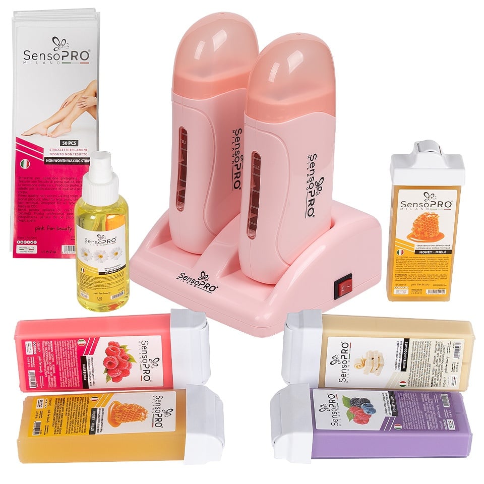 Descriere Kit Epilare Ceara SensoPRO Duo Pink Star + CADOU Rezerva Ceara Aplicator Ingust este perfect pentru o sedinta de epilare confortabila si eficienta. Contine toate produsele necesare pentru a indeparta rapid parul nedorit, rezultatul fiind o piele catifelata pentru un timp indelungat. Este potrivit atat pentru saloanele de infrumusetare, cat si pentru uz personal. Ceara de unica folosinta este usor de folosit, aceasta venind intr-un recipient cu aplicator. Astfel, produsul va fi intins uniform pe piele. Se poate folosi pentru cosmetizare sprancene, epilare mustata, axila, maini, picioare, inclusiv zona inghinala. Ceara cu textura extra fina nu agreseaza pielea si o lasa catifelata pentru o perioada lunga de timp. Mai mult decat atat, aceasta stimuleaza regenerarea pielii dupa epilare, datorita ingredientelor speciale din compozitie. Descriere Kit Epilare Ceara SensoPRO Duo Pink Star + CADOU Rezerva Ceara Aplicator Ingust contine urmatoarele produse: - 1 x Incalzitor Ceara Dublu cu Suport SensoPRO Milano, Double Candy Star : este dotat cu suport dock in dublu si dispune de 2 incalzitoare ceara. Este conceput special pentru incalzirea rezervelor de ceara de unica folosinta de 100 ml. Este prevazut cu zone transparente pe laterale ce permit observarea cantitatii de ceara de epilat ramasa. - 1 x Rezerva Ceara Epilat Unica Folosinta SensoPRO Milano, Miere de Albine: este potrivita tuturor tipurilor de piele, inclusiv pentru cea sensibila. Asigura o epilare eficienta, sigura si fara a crea senzatia de disconfort. - 1 x Rezerva Ceara Epilat Unica Folosinta SensoPRO Milano, White Chocolate: este potrivita tuturor tipurilor de piele, inclusiv pentru cea sensibila. Asigura o epilare eficienta, sigura si fara a crea senzatia de disconfort. - 1 x Rezerva Ceara Epilat Unica Folosinta SensoPRO Milano, Forest Fruits: este potrivita tuturor tipurilor de piele, inclusiv pentru cea sensibila. Asigura o epilare eficienta, sigura si fara a crea senzatia de disconfort. - 1 x Rezerva Ceara Epilat Unica Folosinta SensoPRO Milano, Raspberry: este potrivita tuturor tipurilor de piele, inclusiv pentru cea sensibila. Asigura o epilare eficienta, sigura si fara a crea senzatia de disconfort. - 1 x Benzi Epilat Hartie fara Fibre SensoPRO Milano, 50buc - 1 x Ulei dupa Epilare cu Musetel SensoPRO Milano, 100ml CADOU : 1 x Rezerva Ceara Epilat Unica Folosinta SensoPRO Milano, Miere de Albine, Aplicator Ingust. * In cazul indisponibilitatii rezervei de ceara cu aplicator ingust, aceasta va fi inlocuita cu o rezerva de ceara cu aplicator normal.