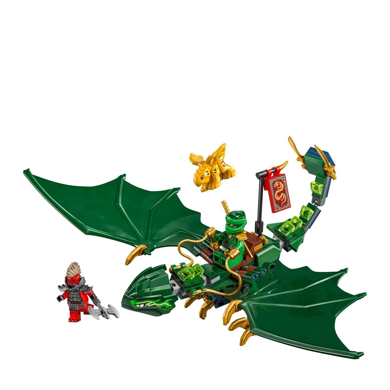 LEGO NINJAGO Dragonul Verde de Pădure al lui Lloyd aduce în prim-plan o creatură legendară cu aripi mobile și detalii spectaculoase, perfectă pentru aventuri pline de acțiune. Setul conține 128 de piese și este recomandat copiilor de la 6 ani în sus. Include minifigurinele Lloyd și un cercetaș dragonian, alături de un pui de dragon auriu, pentru povești de luptă și curaj în inima pădurii.