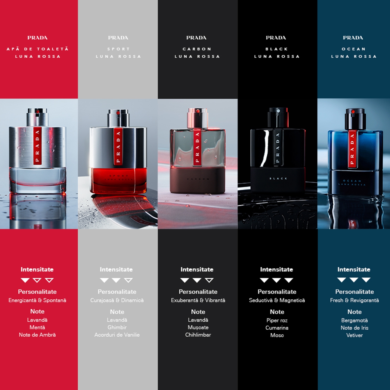 Luna Rossa Ocean Eau de Toilette este un parfum masculin modern, proaspăt și acvatic, care încapsulează o explozie de bergamotă în contrast cu rafinamentul și senzualitatea extremă a notelor de vetiver și de iris elegant. Experimentați un mix olfactiv unic, captivant și masculin cu acest nou parfum pentru bărbați.​ Sticla Prada Luna Rossa Ocean este explorare a universului maritim în adâncurile albastre ale oceanului. Aceasta are forme masculine și o gradație sofisticată de albastru, este intensă și puternică, o referire la reflexiile intrigante ale apei. Luna Rossa Ocean este un parfum al contrastelor: prospețimea bergamotei se alătură aromelor picante și lemnoase extreme ale vetiverului, care se îmbină cu eleganța notelor de iris.​ Aceste note intense prind viața la atingerea pielii și se tranforma intr-o semnatură unică cu acorduri fougere. Pulverizati apa de toaletă Luna Rossa Ocean direct pe piele, în special în zonele de puls: încheietura mâinii, interiorul coatelor, baza gâtului, în spatele urechii. Parfumul este intensificat de caldura propriului corp.