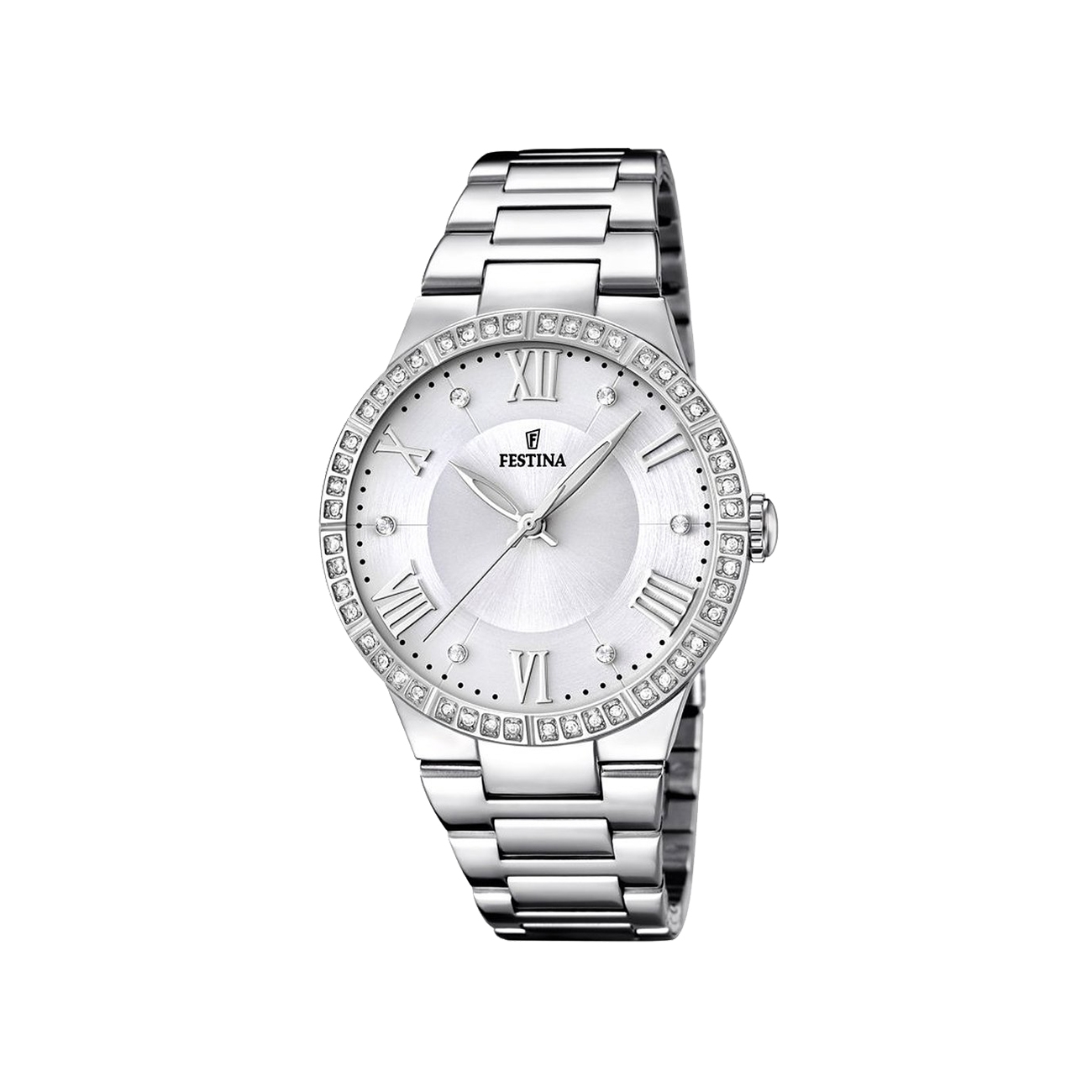 Acest ceas fabulos Festina Mademoiselle F16719/1 ce straluceste in orice lumina adauga o nota glamour tintelor tale de zi cu zi. Ceasul este realizat din otel inoxidabil de cea mai buna calitate si are o rama cu aplicatii de cristale, pozitionata in jurul unui cadran argintiu cu trei mini cadrane si indicatori orari eleganti de tip numere romane si cristale. Bratara din otel inoxidabil completeaza perfect aspectul sofisticat feminin al acestui accesoriu.