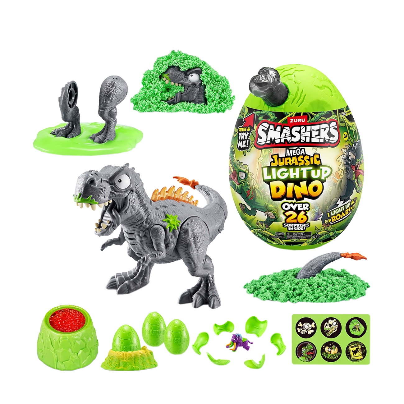 Ouăle uriașe SMASHERS ascund o aventură preistorică cu peste 26 de surprize înăuntru. Setul permite asamblarea unui dinozaur impresionant care se aprinde și scoate sunete. Copiii pot sparge oul, explora diverse texturi (slime, nisip modelabil etc.), descoperi ouă mici și accesorii, și finaliza construcția dinozaurului. Acest produs este disponibil în mai multe modele. Acesta se vinde individual, iar livrarea se va realiza în mod aleator. Nu se poate alege un anumit model.