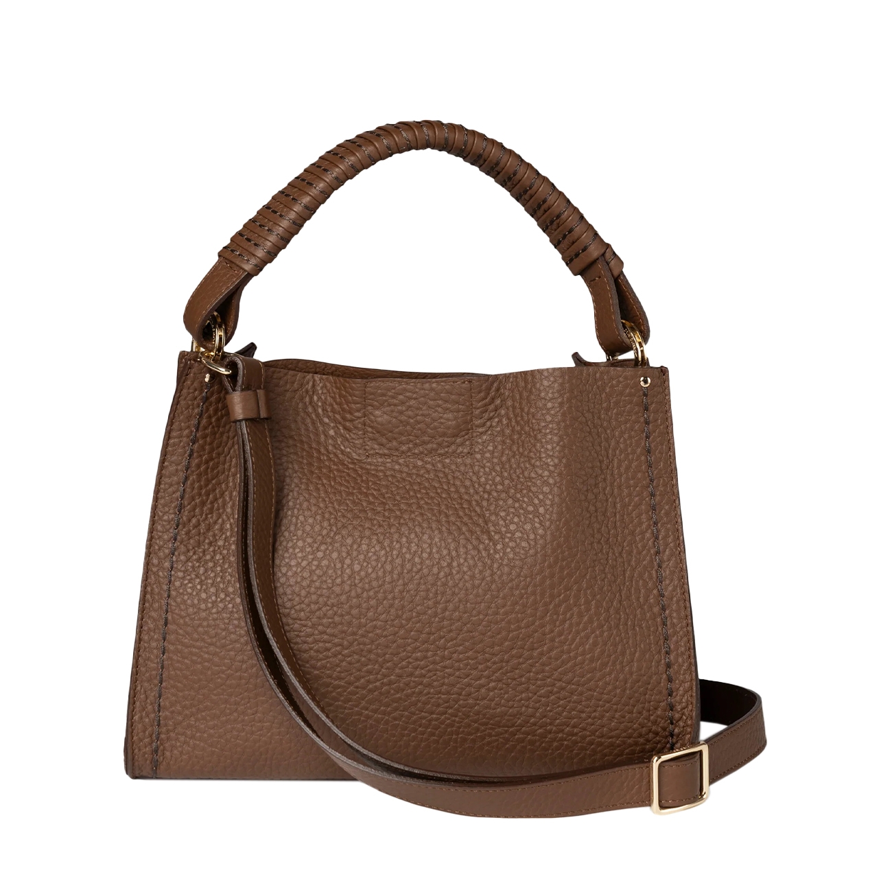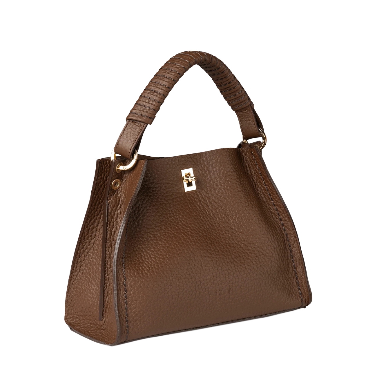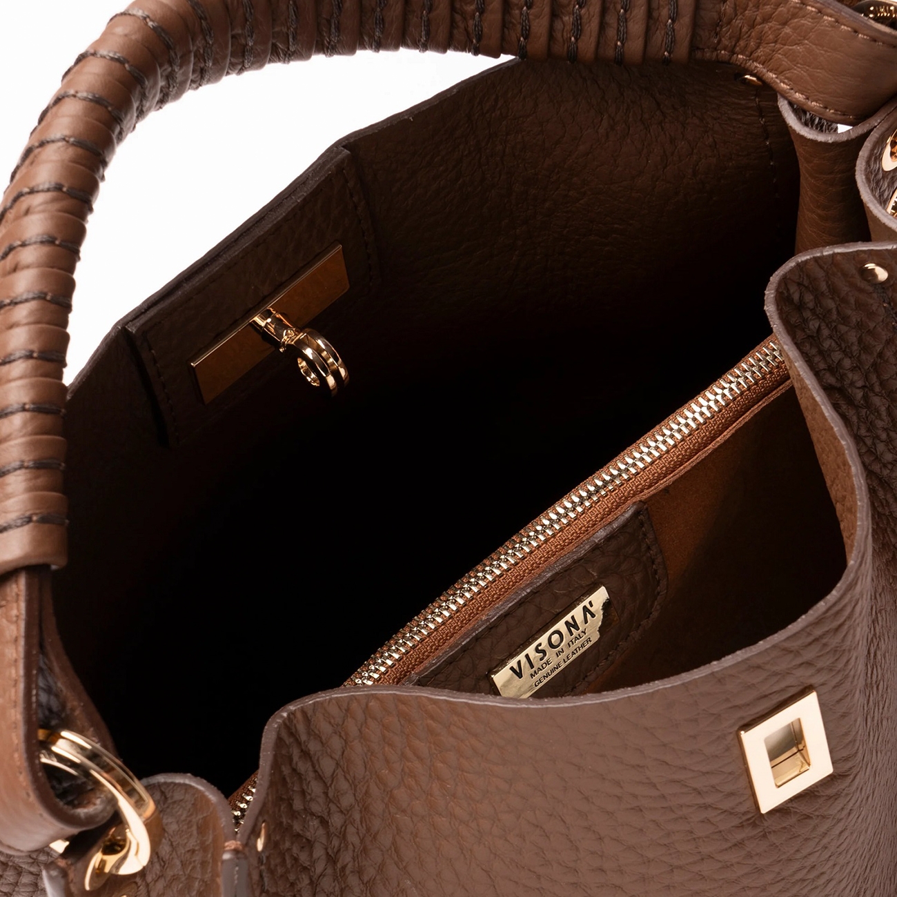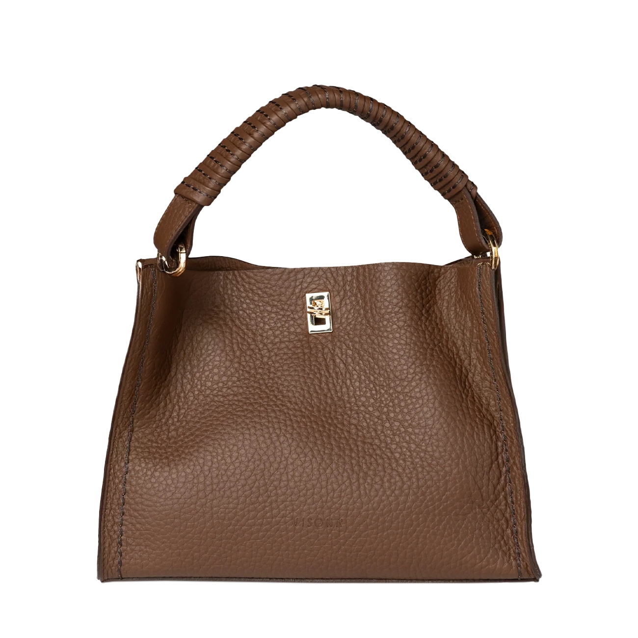 Geanta Visona Mia Top Handle emană eleganță discretă prin designul său geometric și finisajul sofisticat din piele texturată într-o nuanță caldă. Mânerul superior împletit adaugă un detaliu rafinat și tactil, oferind confort la purtare, în timp ce accesoriile metalice aurii completează armonios estetica atemporală.