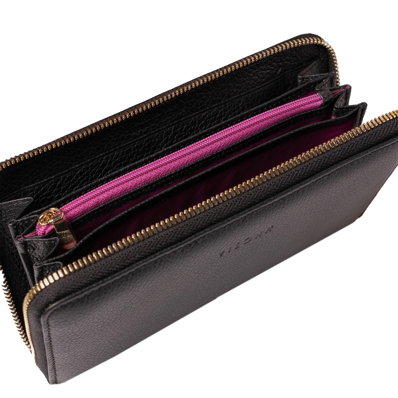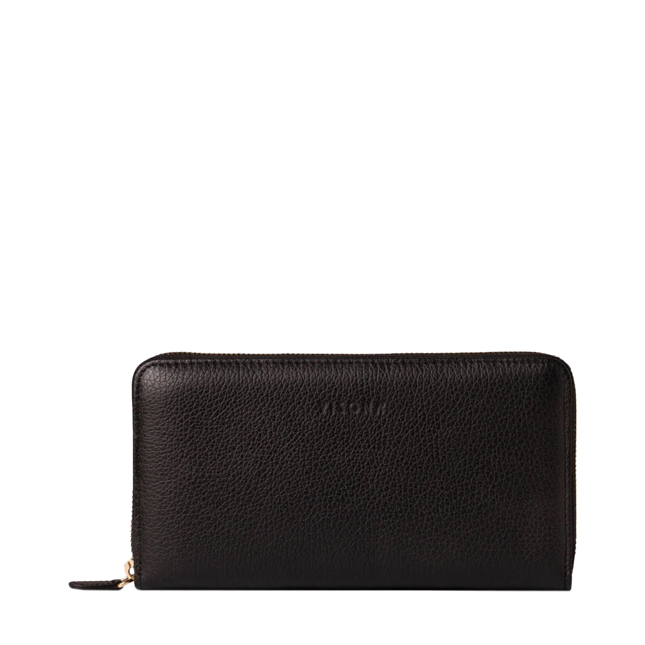 Portofelul Visona este confecționat din piele texturată de înaltă calitate și are un design clasic, cu linii curate și închidere cu fermoar pe toată lungimea. Interiorul bine compartimentat oferă spațiu generos pentru carduri, bancnote și monede, fiind o alegere practică și elegantă pentru utilizarea zilnică.