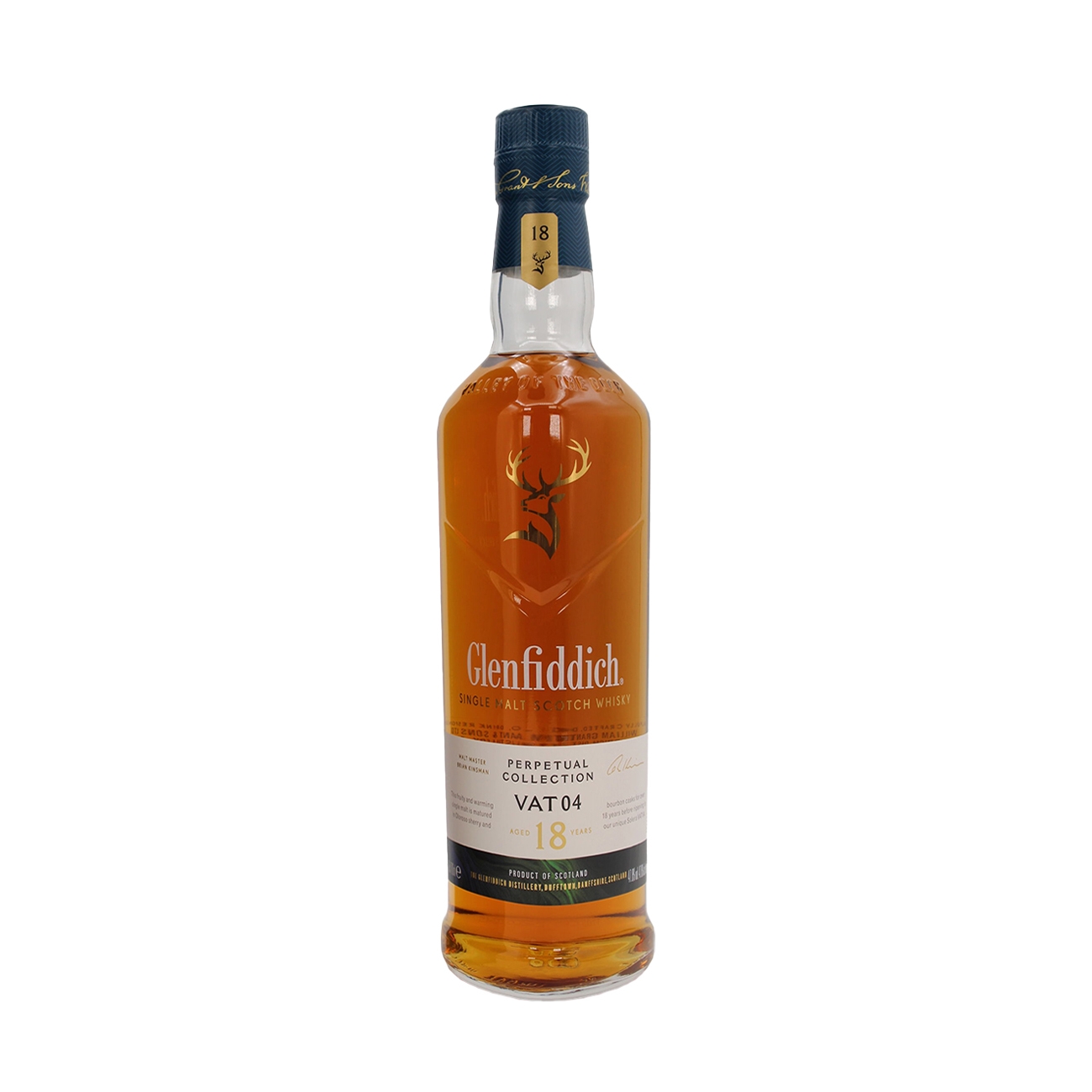Glenfiddich este un brand ce se mândrește cu originile sale. Nu sunt mulți cei care pot spune că au construit o distilerie cu propriile mâini, însă exact așa a început povestea acestui brand. William Grant a muncit din greu pentru a-și îndeplini visul de-o viață de a avea propria distilerie, iar cu ajutorul familiei a reușit. Glenfiddich este un cuvânt galic ce se traduce ca „valea cerbului”. The Perpetual Collection este o gamă deosebită de whisky-uri aflate într-o mișcare perpetuă, în interiorul unor butoaie care nu au fost niciodată golite. Vat 04 este un single malt excepțional maturat timp de 18 ani în butoaie care au găzduit anterior oloroso sherry și bourbon, ce îi oferă o paletă de arome impresionantă. Are un caracter unic, obținut din amestecarea continuă prin sistemul Solera, iar gustul fin dezvăluie note fructate, având un finiș cald și remarcabil.