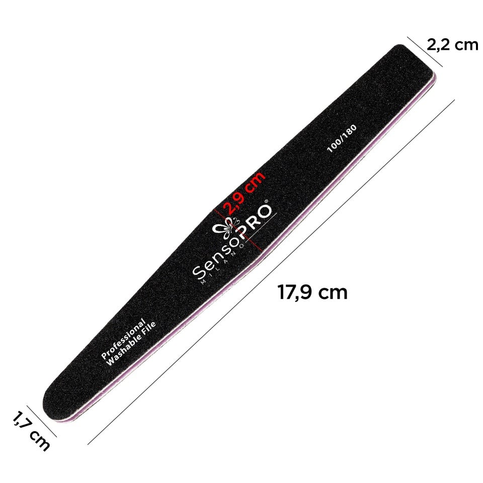 Pila Unghii Picatura granulatia 100/180 - SensoPRO Milano, negru are suprafata de pilire special proiectata pentru pilirea unghiilor false cat si a unghiilor naturale. Asigura o pilire usoara si precisa, nelasand urme pe unghii. In general pilele pot fi folosite atat pentru finisarea, cat si pentru modelarea unghiilor. Dimensiuni: 18 x 2,7 cm