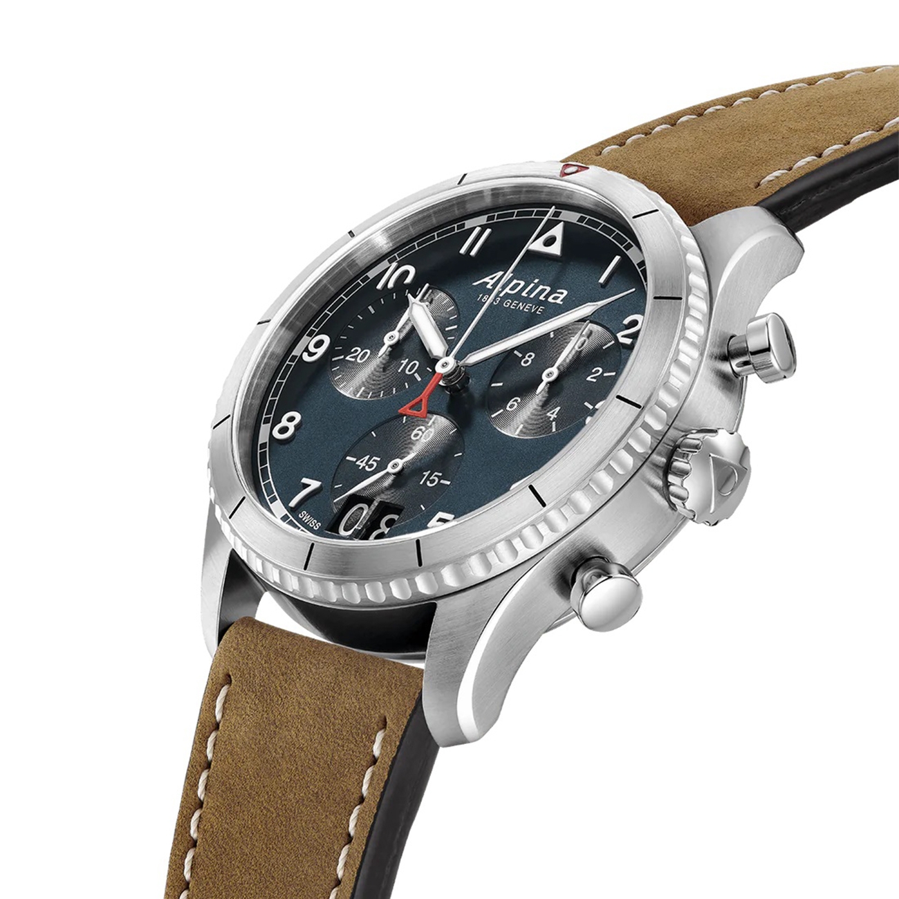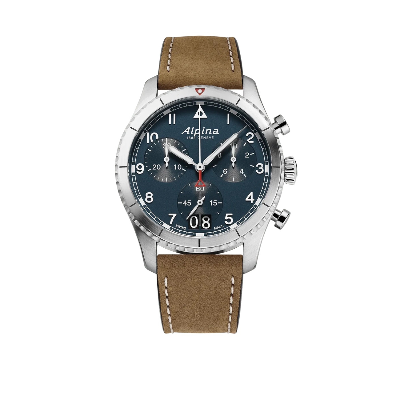 Încă de la începuturile sale în 1883, Alpina, brandul elvețian de lux, a fost un pionier în inovația orologică, redefinind standardele industriei prin calitate, durabilitate și design remarcabil. Fondatorul mărcii, Gottlieb Hauser, era convins că Alpina va deveni un brand de succes mondial datorită calității, durabilității, preciziei și designului ceasurilor sale. Acest ceas elegant și funcțional, Startimer Pilot Quartz Chronograph Big Date, prezintă un design inspirat de aviație, perfect pentru cei care apreciază atât stilul, cât și performanța. Cu o carcasă de 41 mm și o curea din piele de vițel, acest model emană un aer rafinat și robust în același timp. Echipat cu un mecanism quartz, ceasul oferă funcții de ore, minute, secunde, un cronograf pentru măsurarea timpilor și o dată mare la poziția 6, care permite o citire ușoară a datei.