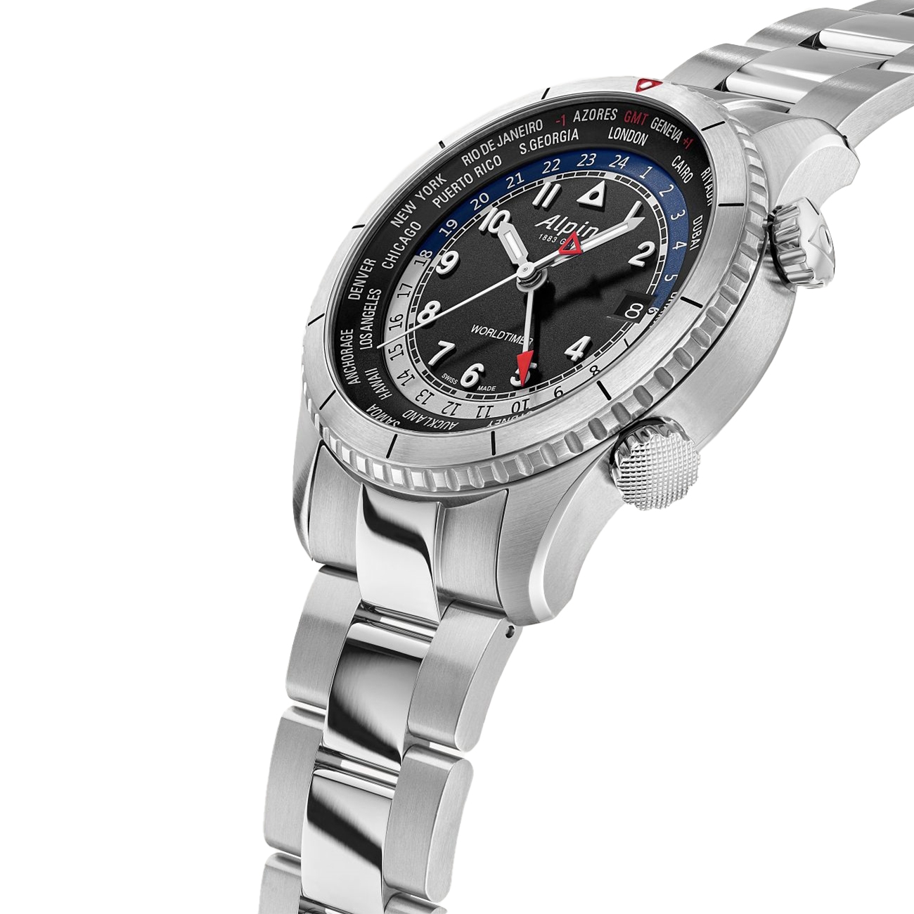 Încă de la începuturile sale în 1883, Alpina, brandul elvețian de lux, a fost un pionier în inovația orologică, redefinind standardele industriei prin calitate, durabilitate și design remarcabil. Fondatorul mărcii, Gottlieb Hauser, era convins că Alpina va deveni un brand de succes mondial datorită calității, durabilității, preciziei și designului ceasurilor sale. Startimer Pilot Quartz Worldtimer este creat pentru cei care călătoresc frecvent și au nevoie de un ceas care să le ofere precizie și funcționalitate la nivel global. Cu o carcasă de 41 mm, acest model are un design robust și elegant, perfect pentru aventurierii moderni. Brățara din oțel inoxidabil asigură o rezistență sporită și un confort pe măsură, iar mecanismul de quartz garantează precizie în orice colț al lumii.