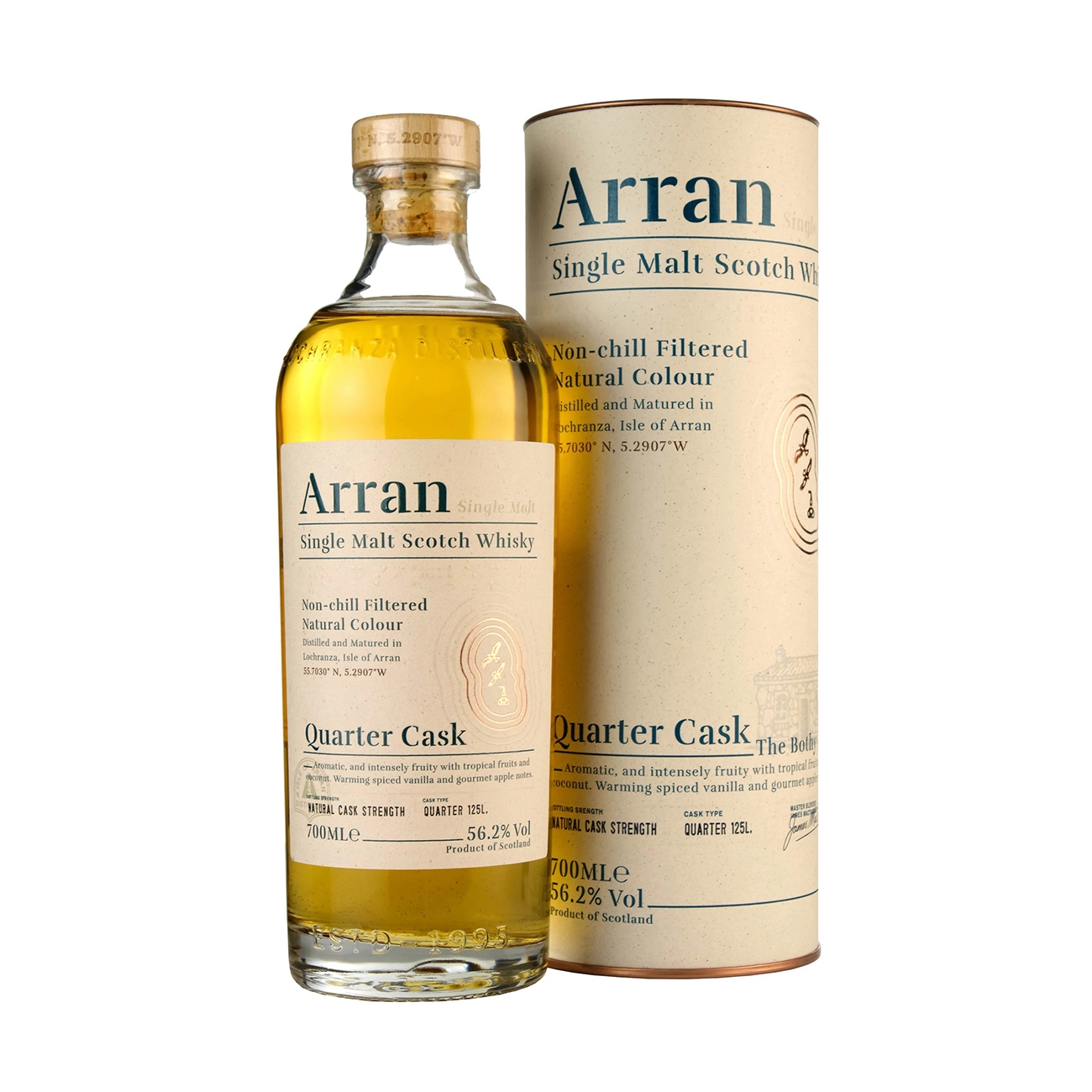 Arran Whisky și-a început producția în 1994. Pe 16 decembrie 1994 a început construcția distileriei în Lochranza. Pentru scurt timp acest proces a fost oprit din cauza unor vulturi aurii care și-au făcut cuib. Aceștia au devenit parte importantă din familia Arran, putând fi văzuți și în ziua de astazi. Centru de vizitatori a fost deschis chiar de Regina Elisabeta a II-a, în 1997, unde i s-au oferit și două butoaie de vin pentru Prinții William și Harry. Butoaiele încă se află în depozitul distileriei. Quarter Cask 'The Bothy' este o alegere perfectă pentru cunoscători și colecționari deopotrivă. Aromele sale distincte de citrice, scorțișoară și vanilie se îmbină armonios cu gustul dulce de miere, creând o experiență gustativă memorabilă.