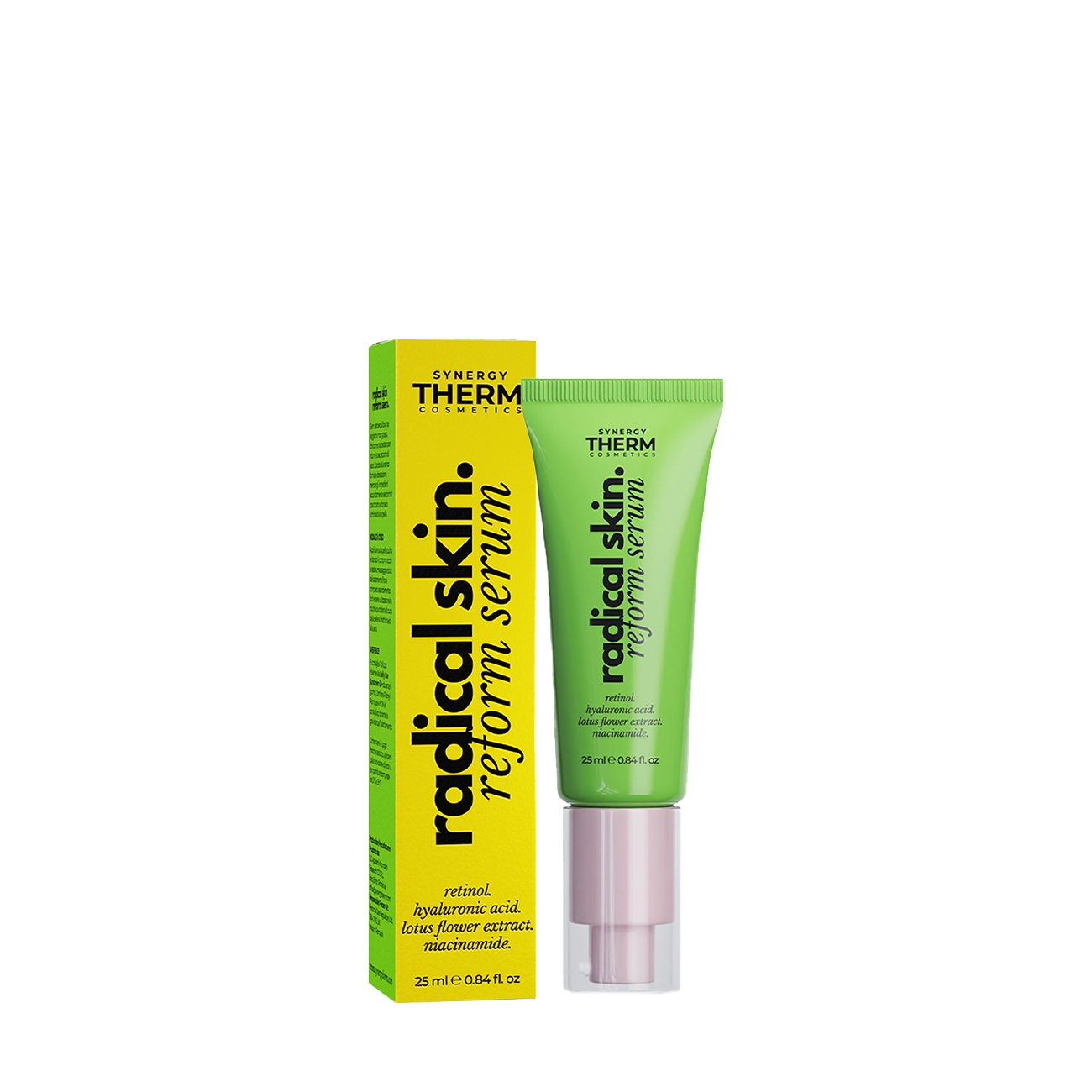 Synergy Therm Cosmetics este o gamă de produse dermato-cosmetice special formulate pentru a oferi îngrijire avansată pielii, având la bază apă termală de calitate superioară. Fiecare produs din această linie este creat cu o combinație unică de ingrediente active, atent selecționate pentru a adresa diverse nevoi ale pielii. Radical Skin Reform Serum este soluția ideală pentru tenul cu tendințe de exces de sebum și pentru a combate semnele îmbătrânirii. Această formulă avansată combină ingrediente puternice pentru a oferi o îngrijire completă, echilibrând secreția de sebum, matifiind pielea și prevenind ridurile. Niacinamida reglează producția de sebum, ajutând la combaterea luciului excesiv și reducerea porilor dilatați. Retinolul stimulează regenerarea celulară, contribuind la reducerea ridurilor fine și la prevenirea apariției acestora.