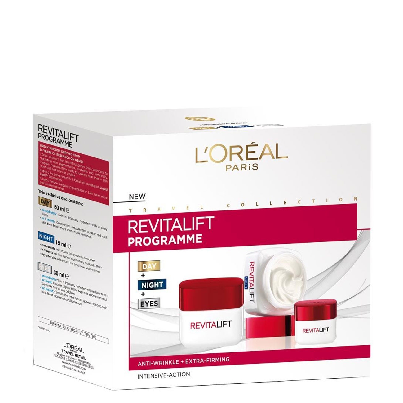 L'oreal Revitalift Programme iti ofera trei produse de frumusete esentiale in ritualul tau zilnic de ingrijire a tenului: o crema de zi matasoasa, usor absorbita in piele, care revitalizeza si netezeste instant pielea, dandu-i un aspect frumos si uniform, de catifea, o crema nutritiva, anti-imbatranire, ce sprijina tenul tau in procesul natural de reparare si regenerare pe parcursul noptii si un tratament anti-rid inovator care ajuta eficient la combaterea semnelor imbatranirii aparute in zona delicata din jurul ochilor.