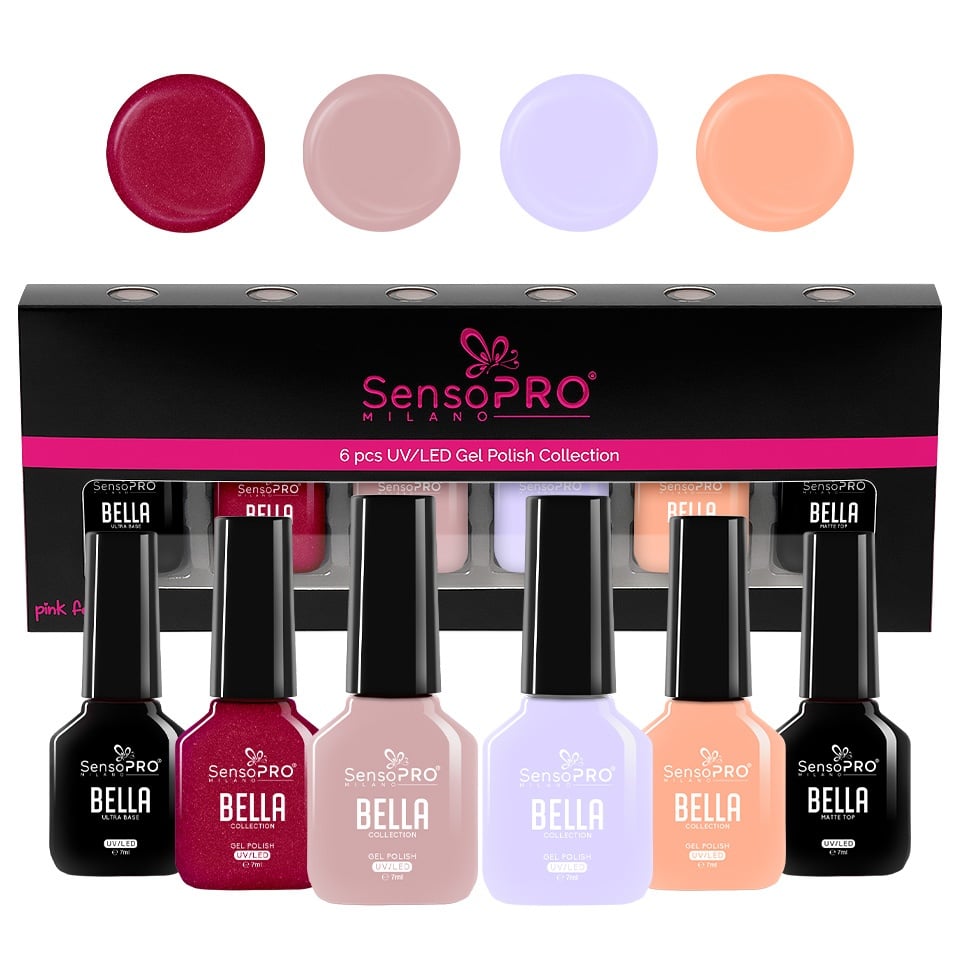 Alege Set 10 Oje Semipermanente, Base Coat & Top Coat 7ml SensoPRO Milano, Timeless Bella pentru manichiuri ce iti pun in valoare stilul dinamic, creativitatea si personalitatea unica. ✅ 1 x Oja Semipermanenta SensoPRO Milano BELLA - Magenta Kiss 7ml ✅ 1 x Oja Semipermanenta SensoPRO Milano BELLA - Satin Nude 7ml ✅ 1 x Oja Semipermanenta SensoPRO Milano BELLA - Violet Pastel 7ml ✅ 1 x Oja Semipermanenta SensoPRO Milano BELLA - Hazelnut Butter 7ml ✅ 1 x Top Coat Mat BELLA 7ml ✅ 1 x Base Coat BELLA 7ml Oja Semipermanenta are o consistenta cremoasa, este usor de aplicat si este recomandata atat pentru unghiile tehnice cu gel / acryl cat si pentru cele naturale. Avantaje: ✅ Pigmenti intensi ✅ Vascozitate potrivita ✅ Pensula fina si precisa ✅ Aderenta superioara ✅ Uscare UV / LED ✅ Nuante potrivite pentru orice manichiura ✅ Rezistenta pana la 4 saptamani ✅ Raport excelent calitate - pret. Mod de aplicare: 1. Curatati unghia naturala si matuiti-o cu pila buffer, iar apoi aplicati un strat de primer. 2. Aplicati Primer si uscati la aer. 3. Aplicati Base Coat si uscati unghia 2 min in lampa UV sau 60 secunde in lampa LED. 3. Aplicati un strat de oja si uscati unghia 120s in lampa UV sau 60 secunde in lampa LED. Pentru un efect mai intens aplicati al doilea strat de oja si uscati. 4. Aplicati Top Coat si uscati 2 min in lampa UV sau 60 secunde in lampa LED. Cantitate: 7ml x 6 buc