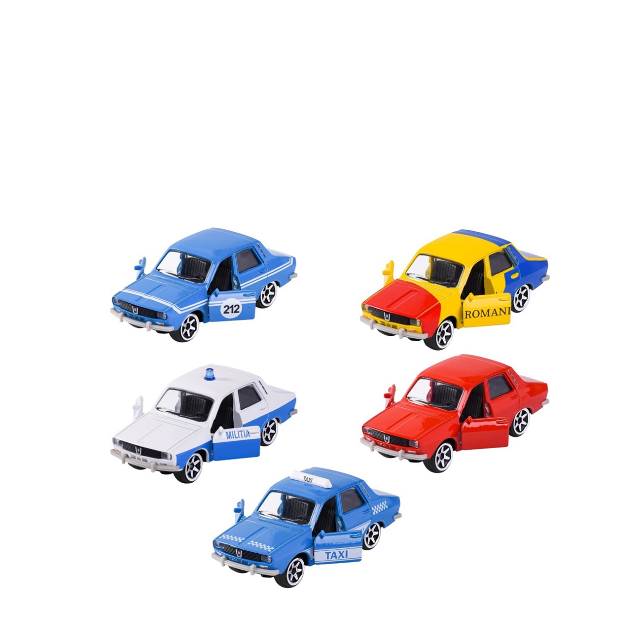 Retrăiește nostalgia șoselelor românești cu acest set-cadou special ce include 5 modele emblematice Dacia 1300, produse de MAJORETTE în ediție de colecție. Fiecare mașinuță este realizată la scară 1:64 și redă fidel aspectul clasic al legendarului model autohton, în variante tematice precum „Militia”, „Taxi România” sau în culori originale care amintesc de epoca de aur a automobilismului românesc.