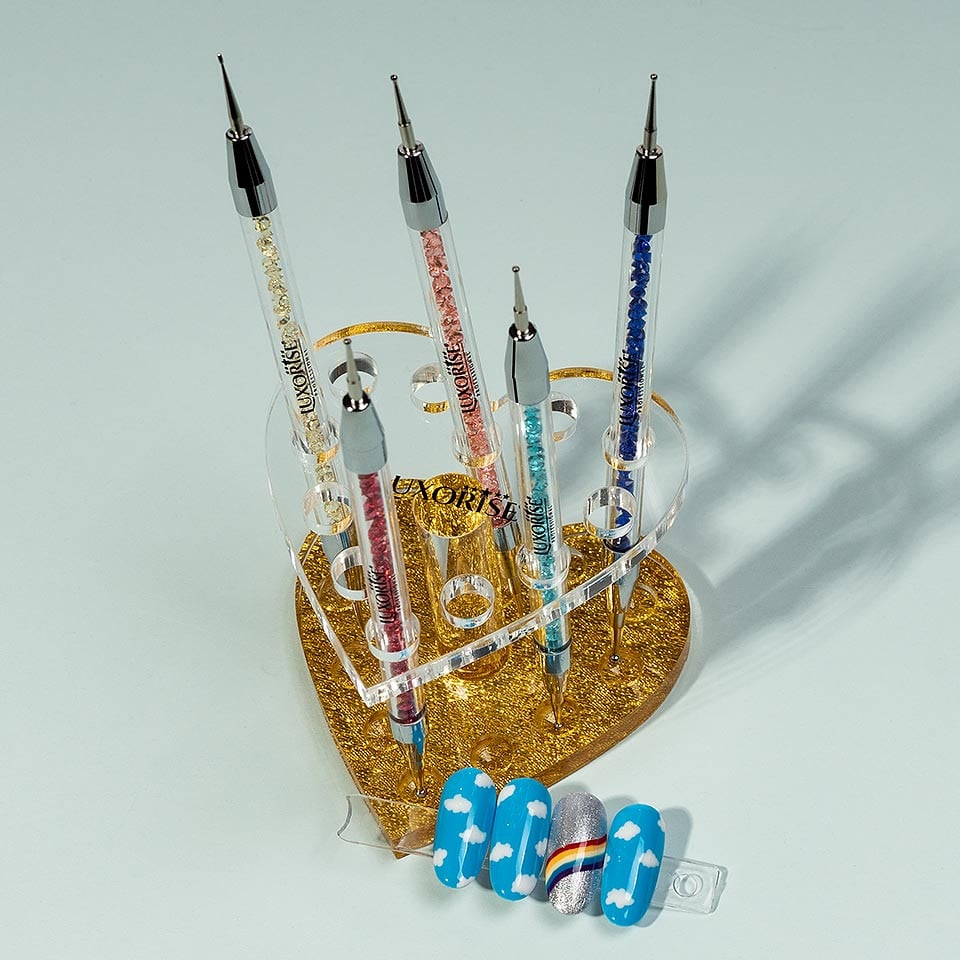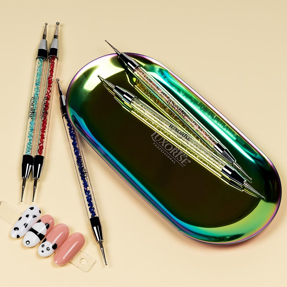 Set 5 Punctatoare pentru unghii Luxury Edition #02, LUXORISE contine ustensile decorate cu cristale de cea mai buna calitate. Fiecare instrument are doua capete de dimensiuni diferite pentru a oferi posibilitati multiple de creatie nail art. De asemenea, acestea permit si decorarea unghiei naturale sau a unghiei false cu puncte si linii fine. Atentie! Tavitele din inox si suporturile din pozele secundare au rol de prezentare si se achizitioneaza seaparat!