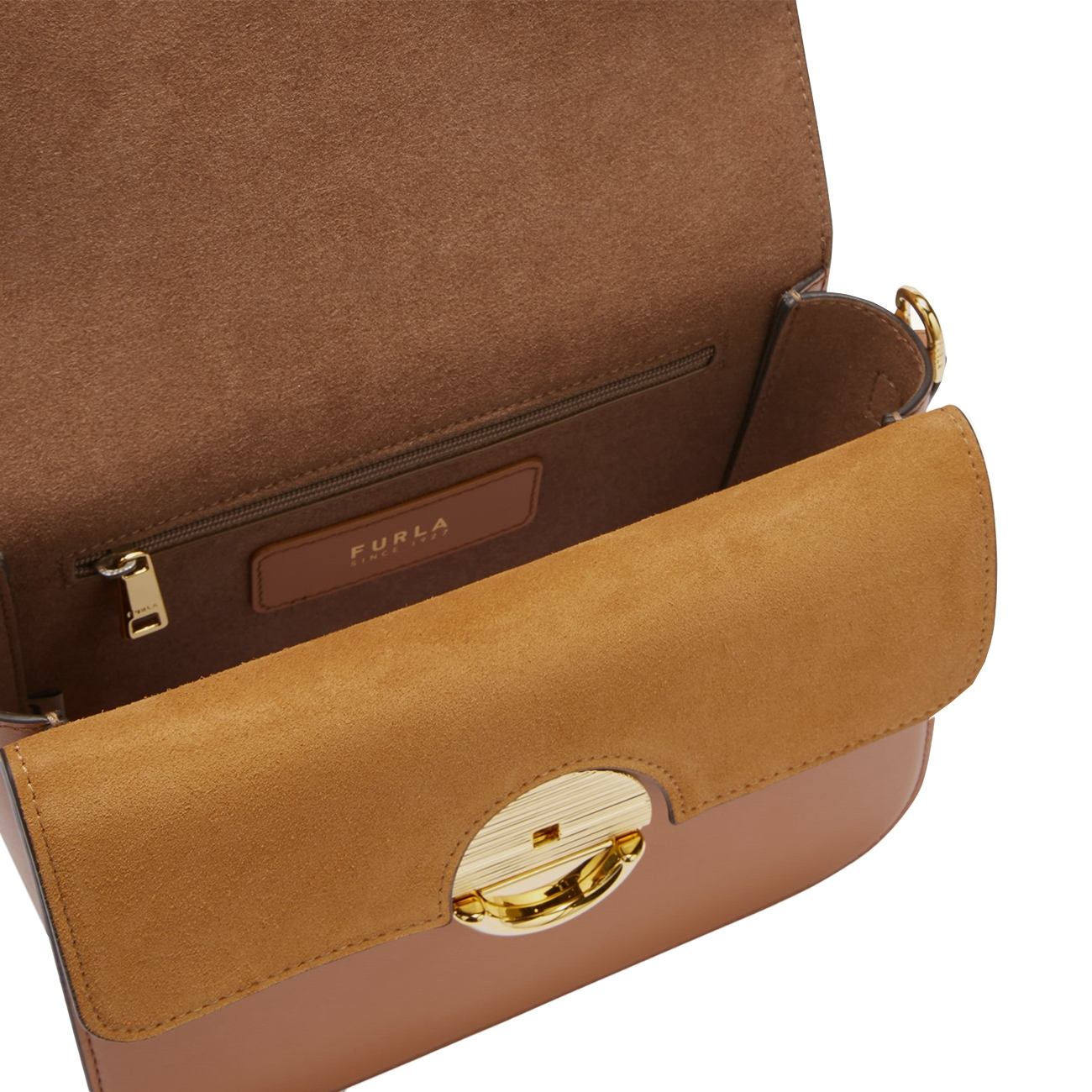 Geanta Furla Sfera are un design rafinat ce combină pielea netedă cu inserții de piele întoarsă, fiind accesorizată cu o închidere rotundă metalică, emblematică pentru colecție. Forma compactă și liniile elegante o transformă într-un accesoriu versatil, ideal pentru ocazii speciale sau ținute de zi cu zi.