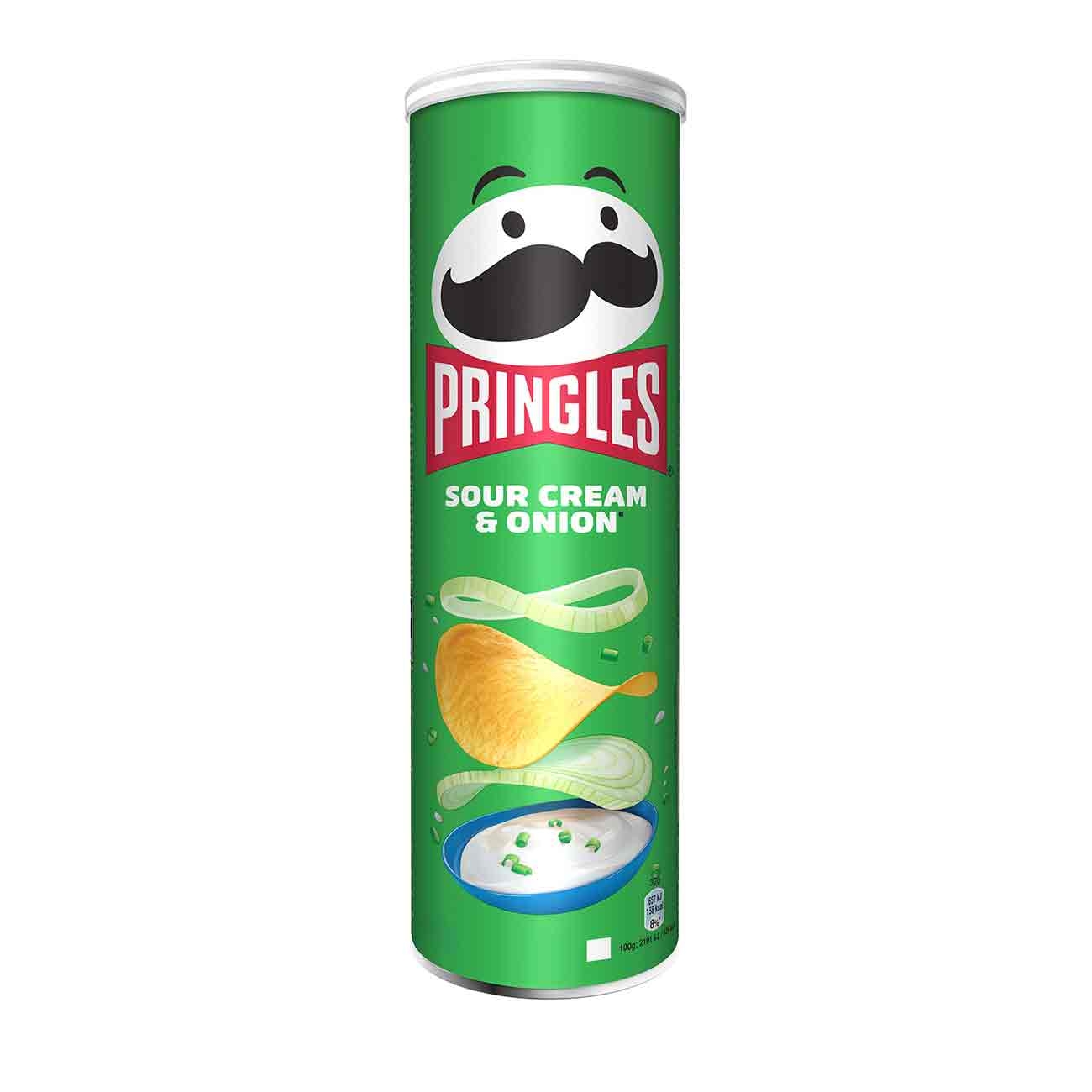 Pringles este unul dintre cele mai populare brand-uri de chipsuri din lume. Odată ce ai deschis o cutie de Pringles nu te vei putea opri până nu o termini! Dacă decizi totuși să păstrezi câteva pentru mai târziu nu este o problemă, ele rămân proaspete și crocante datorită cutiei cu capac ce poate fi închis de câte ori vrei. Celebrele chipsuri vin într-o varietate de sortimente pentru toate gusturile, de la chipsuri simple cu sare la arome de murături, bbq sau cheddar. Această cutie de chipsuri are o delicioasă aromă de smântână și ceapă, o combinație ce creează poate cea mai bună gustare din toate timpurile.