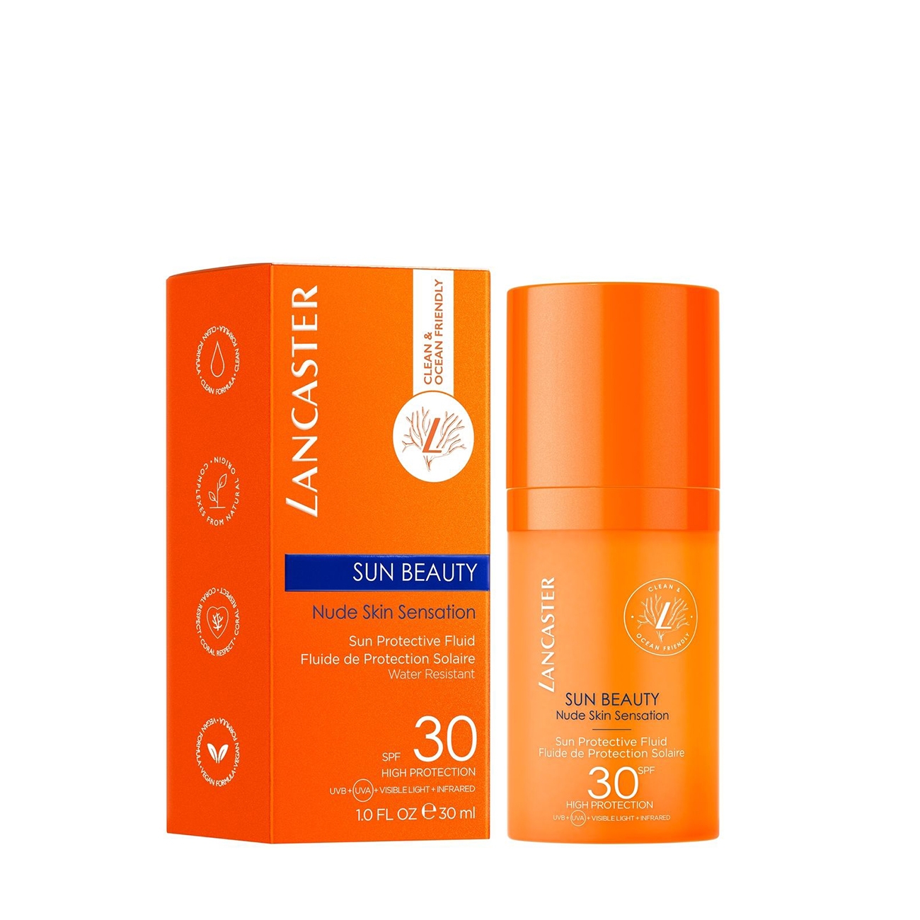 Lancaster Sun Beauty Nude Skin Sensation SPF 30 este un fluid de protecție solară cu textură ultra-ușoară, conceput pentru a oferi o protecție completă împotriva razelor UVA, UVB, luminii vizibile și infraroșii, păstrând în același timp un aspect natural al pielii. Formula este “Clean & Ocean Friendly”, respectuoasă cu pielea și mediul marin — fără filtre dăunătoare coralilor.