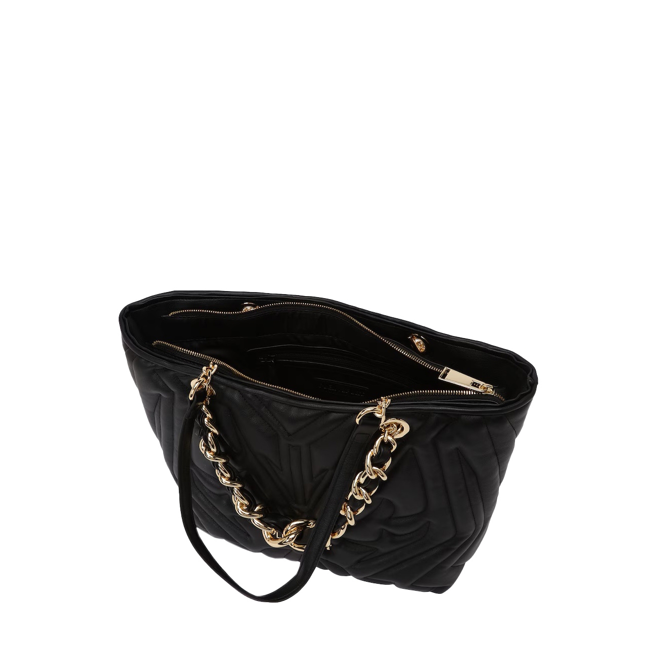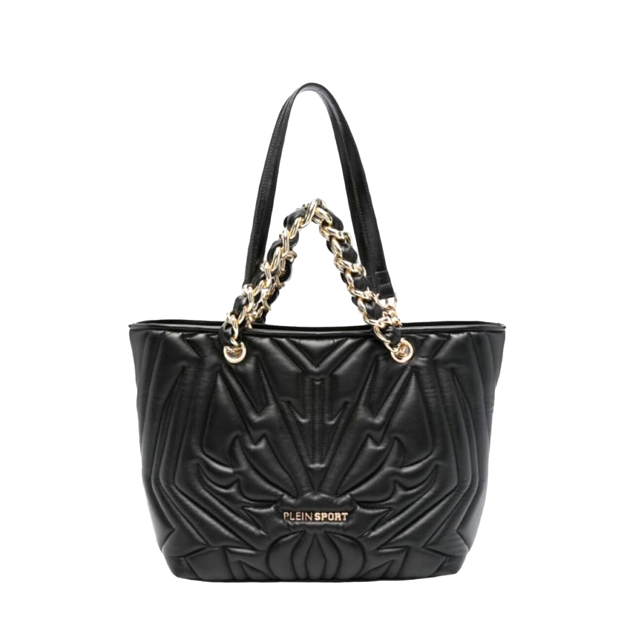 Geantă tip tote pentru femei, confecționată din material cu aspect matlasat, într-o nuanță clasică de negru, având un design impunător cu motive geometrice embosate ce oferă un efect vizual dinamic și sofisticat. Logo-ul metalic auriu Plein Sport aplicat frontal conferă o notă luxoasă, iar mânerele din lanț masiv combinat cu inserții din piele ecologică întăresc caracterul statement al acestui model.