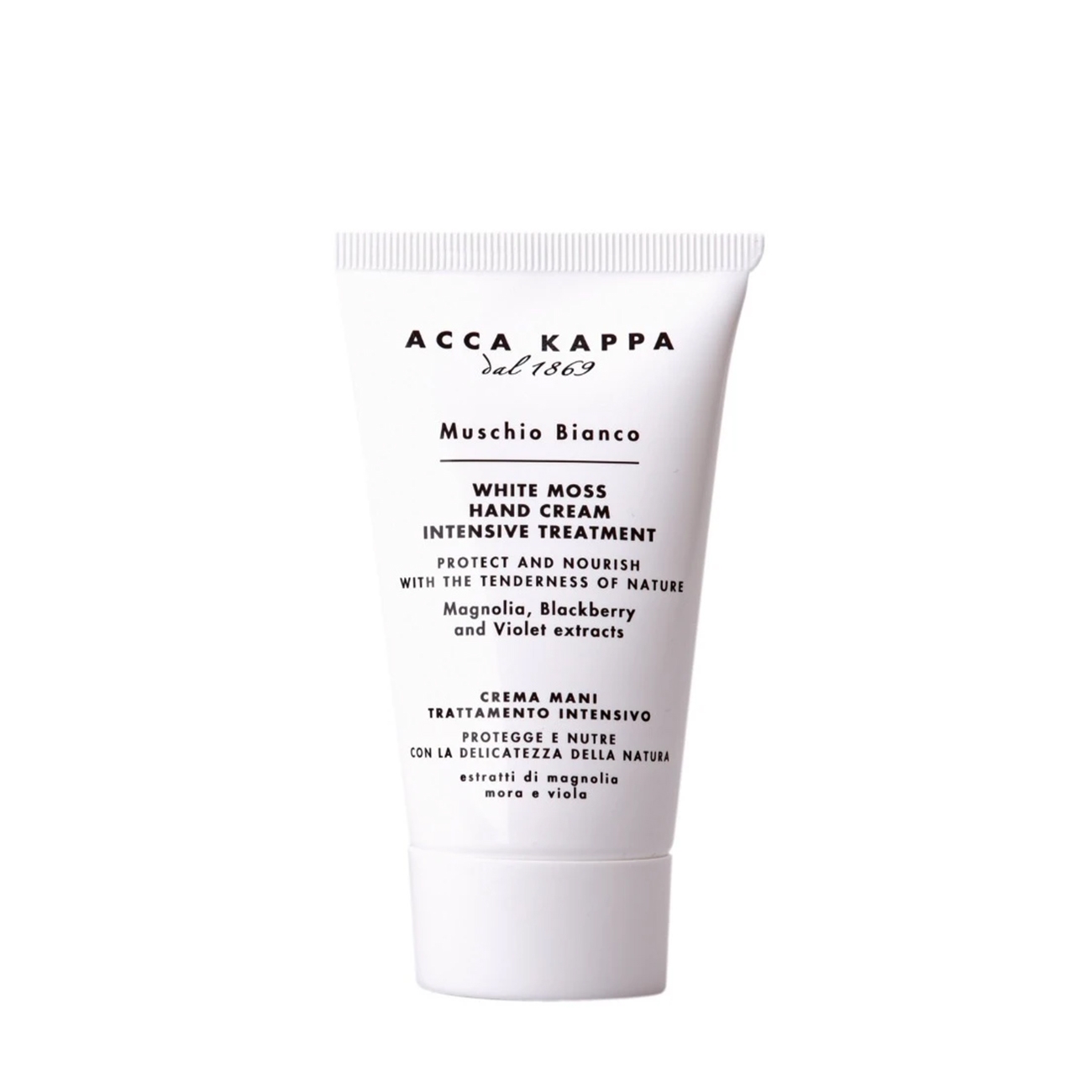 Cremă de mâini intens hidratantă din gama White Moss, semnată Acca Kappa, formulată cu extracte prețioase de magnolie, mure și violete. Hrănește, protejează și catifelează pielea, oferindu-i un parfum delicat, proaspăt și elegant. Textura sa lejeră se absoarbe rapid, lăsând mâinile netede și confortabile, fără senzație de gras.